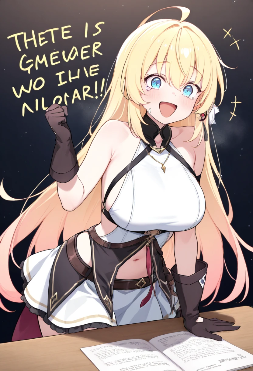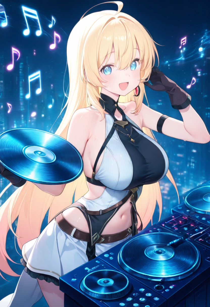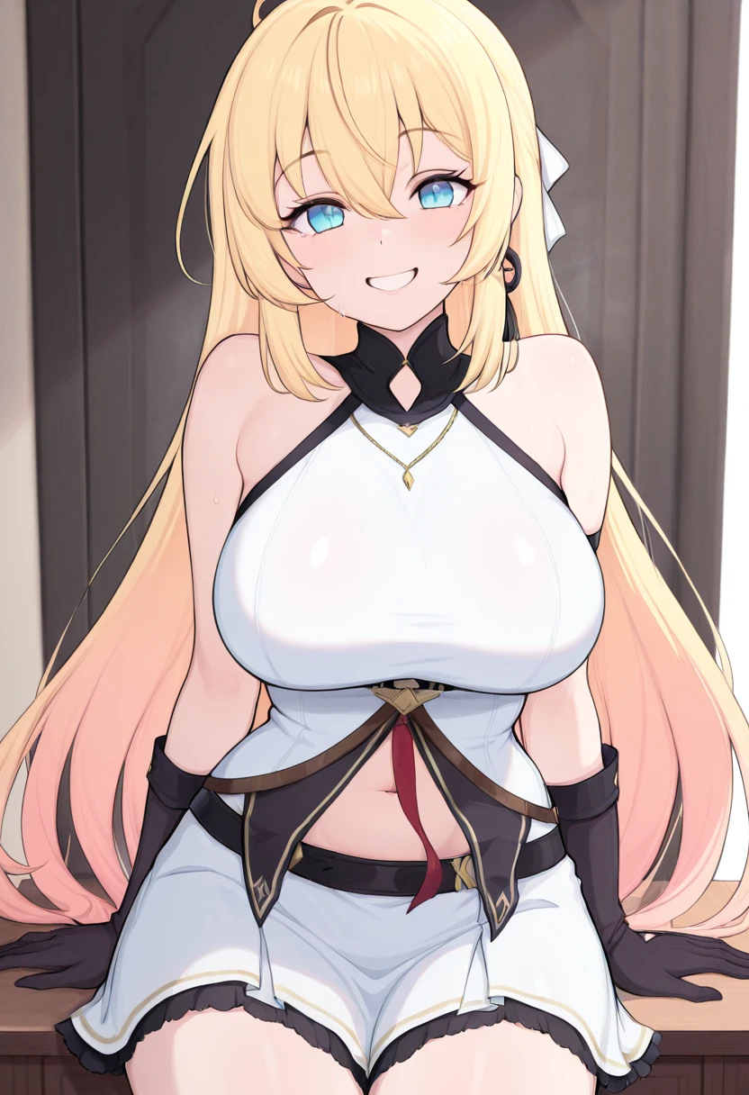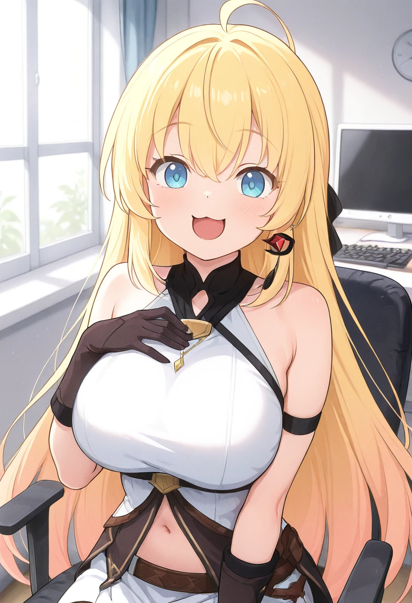 zzNoya, blue eyes, hair between eyes, ahoge, blonde hair, long hair, skirt, navel, sleeveless, gloves,