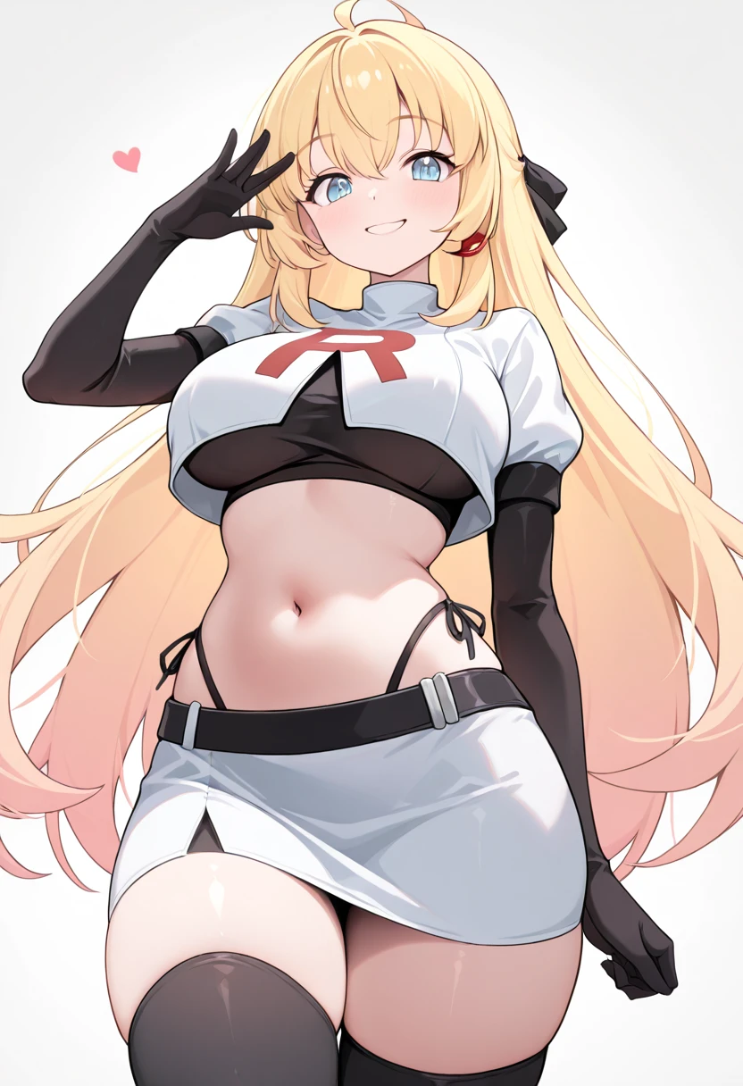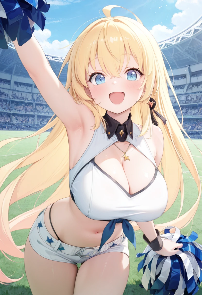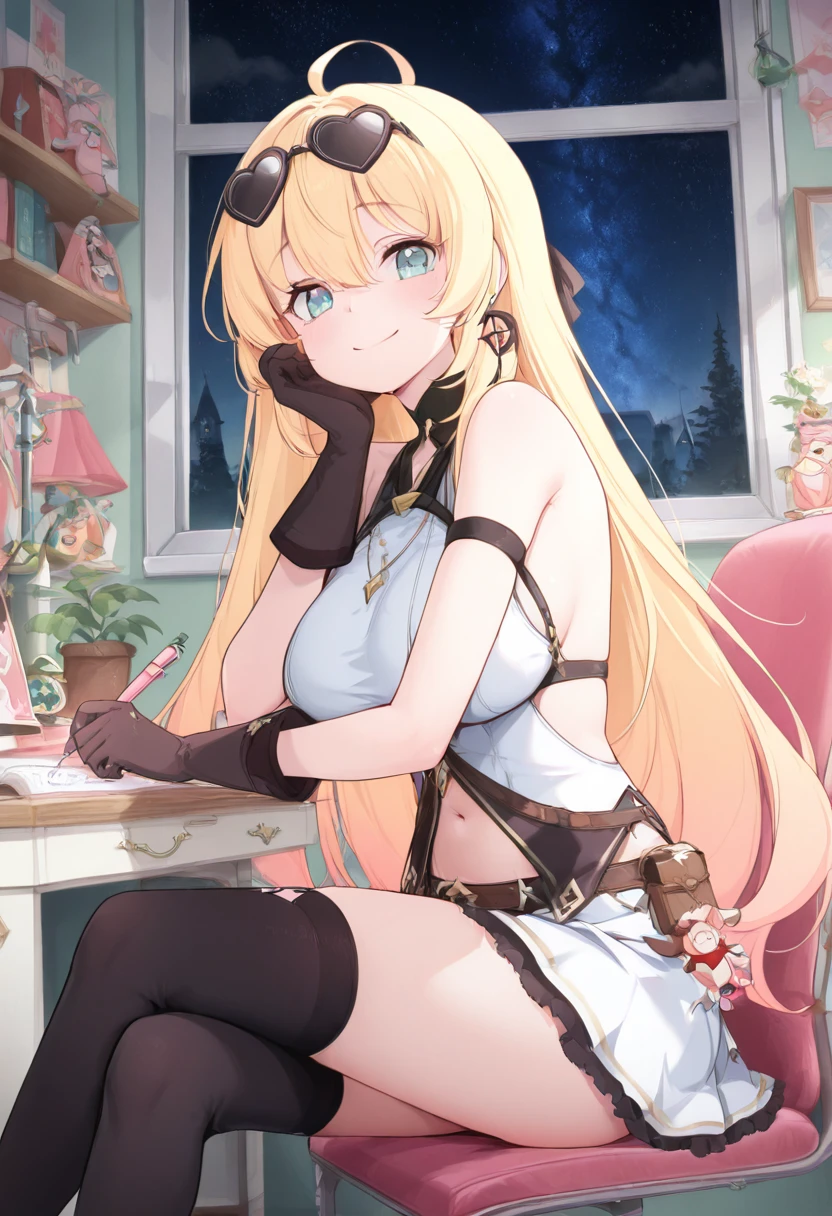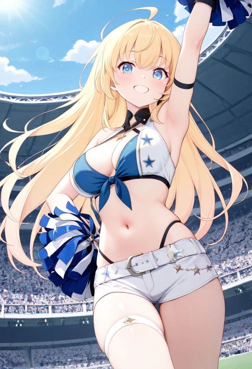 zzNoya, blue eyes, hair between eyes, ahoge, blonde hair, long hair, skirt, navel, sleeveless, gloves,