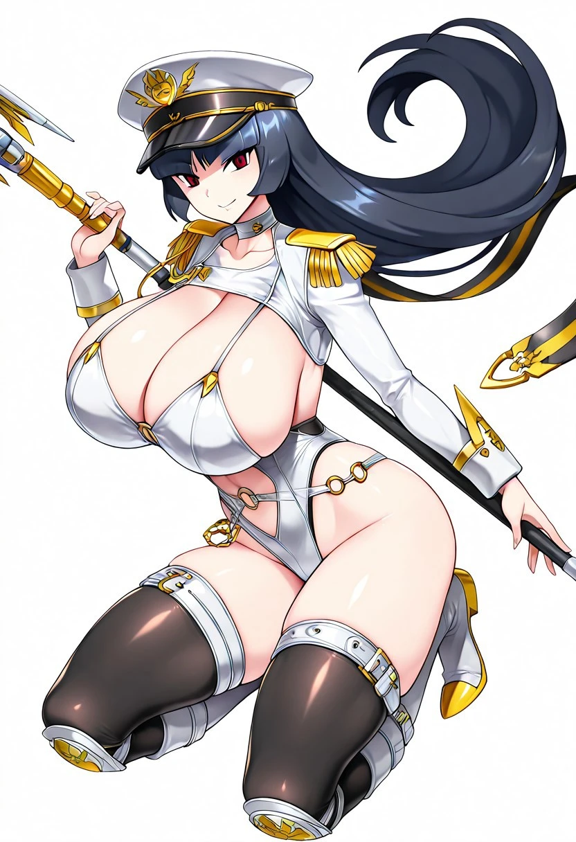 SWS,cleavage,white leotard,revealing clothes,o-ring,clothing cutout,groin,collarbone,navel,epaulettes,peaked cap, thighhighs,navel,thighhighs,thigh strap,long sleeves,uniform,blue back ribbon,