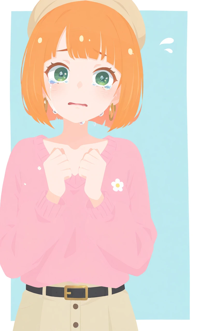 1girl,short hair,orange hair,beige headwear,bob cut,green eyes,makeup,floral print sweater,pink sweater,black belt,beige skirt