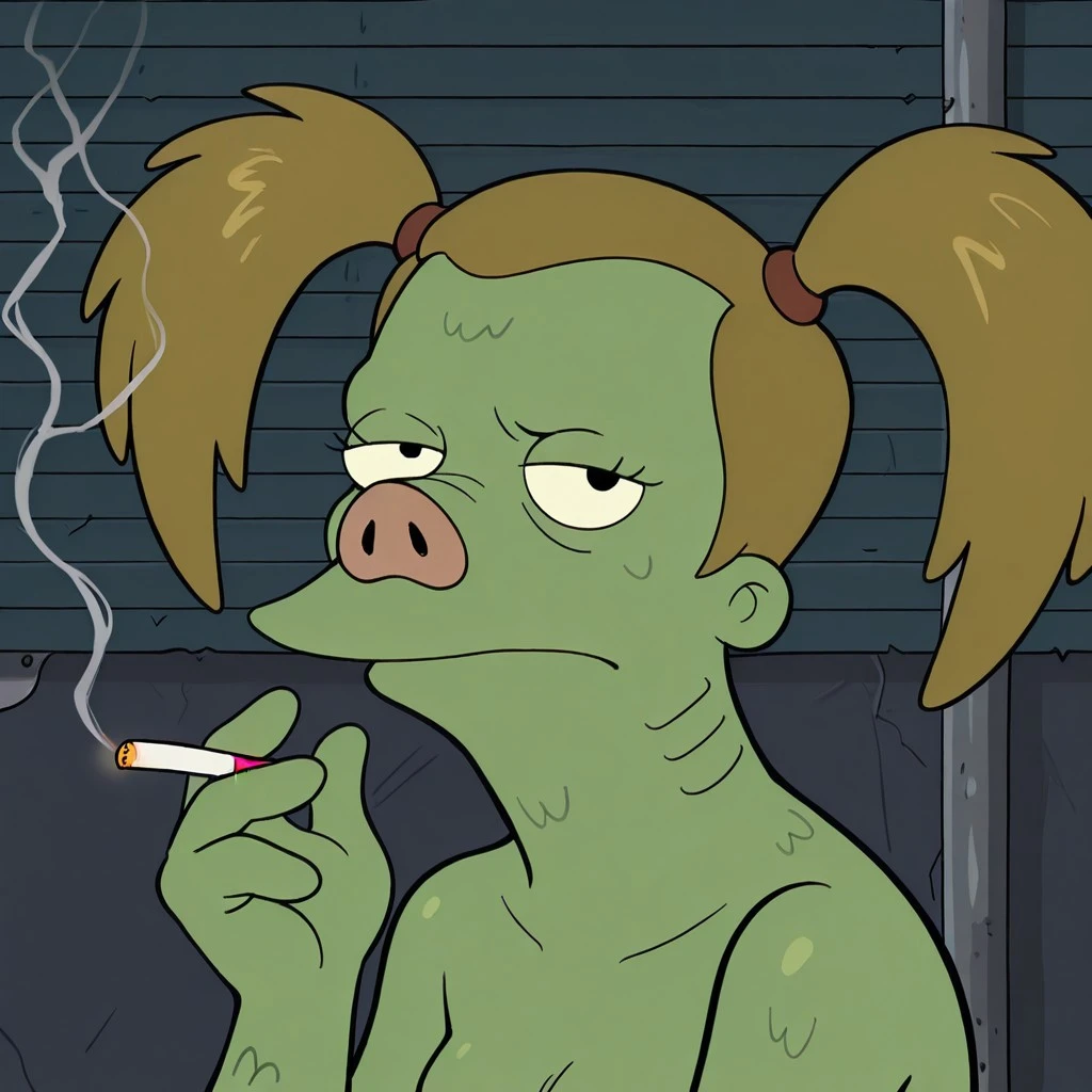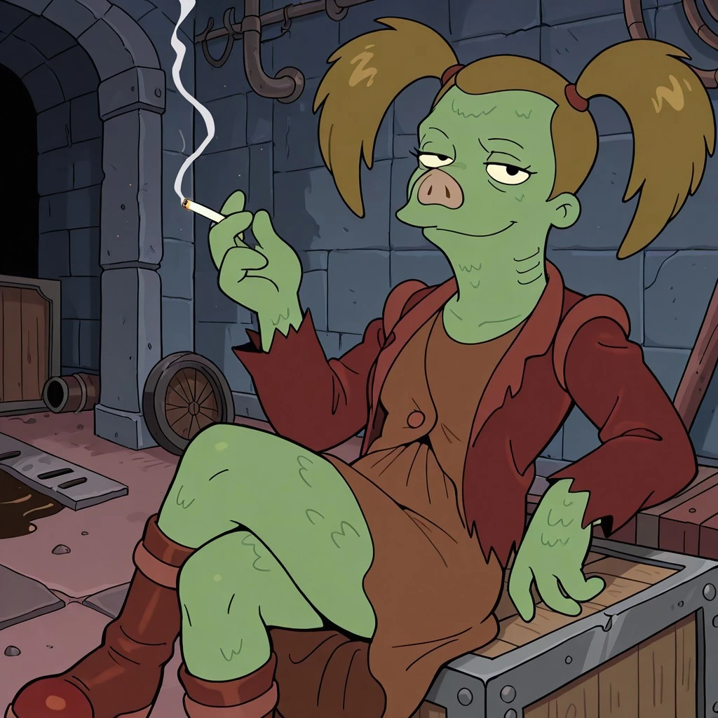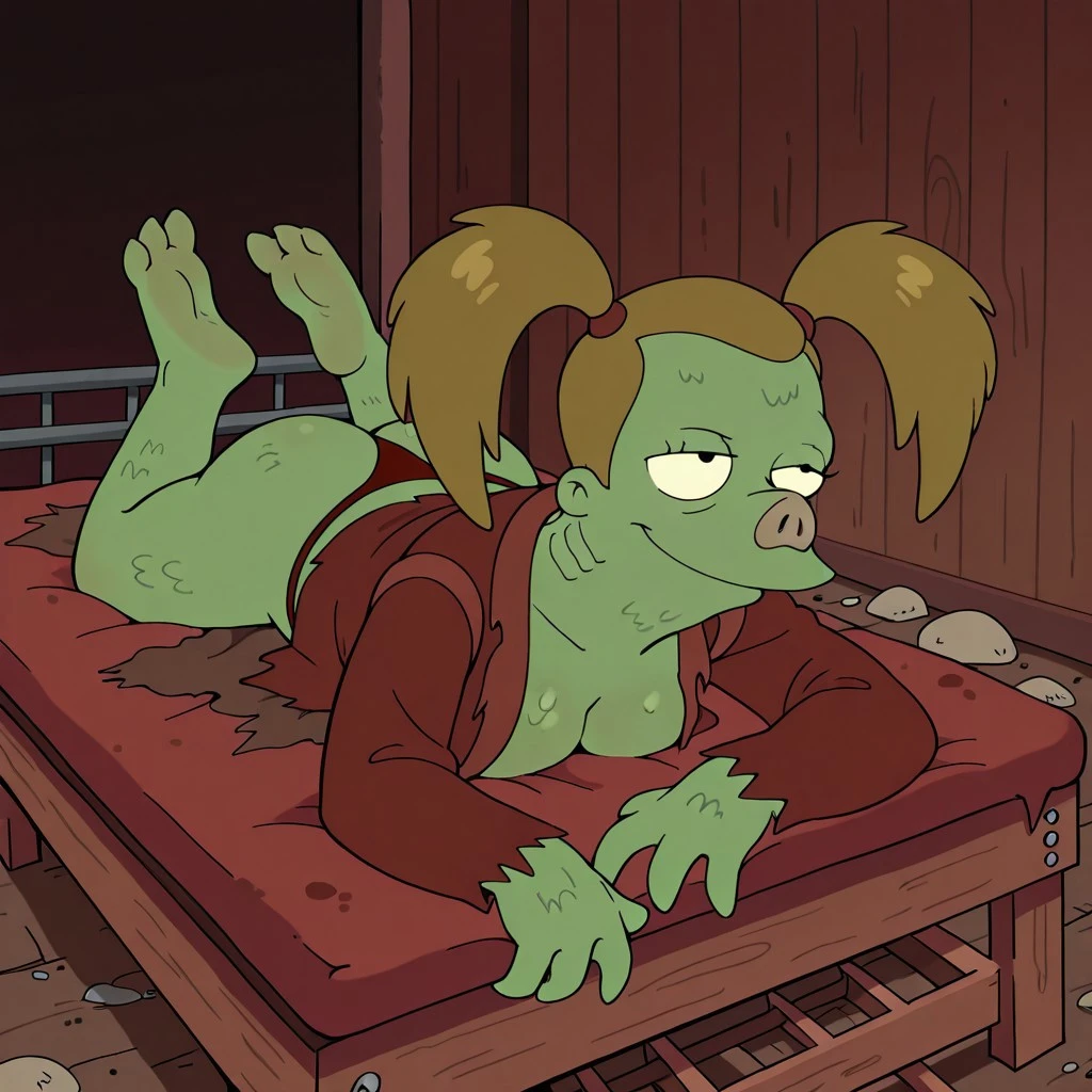 monster female, mutant female, green scaly skin, neck gills, black eyes, pig nose, dark blonde hair, pigtails, brown dress, red jacket, red and brown boots,