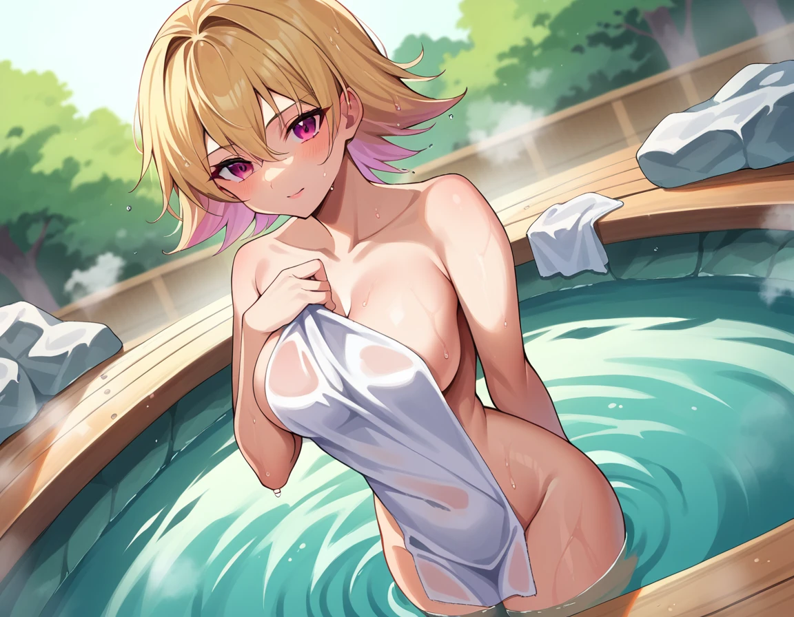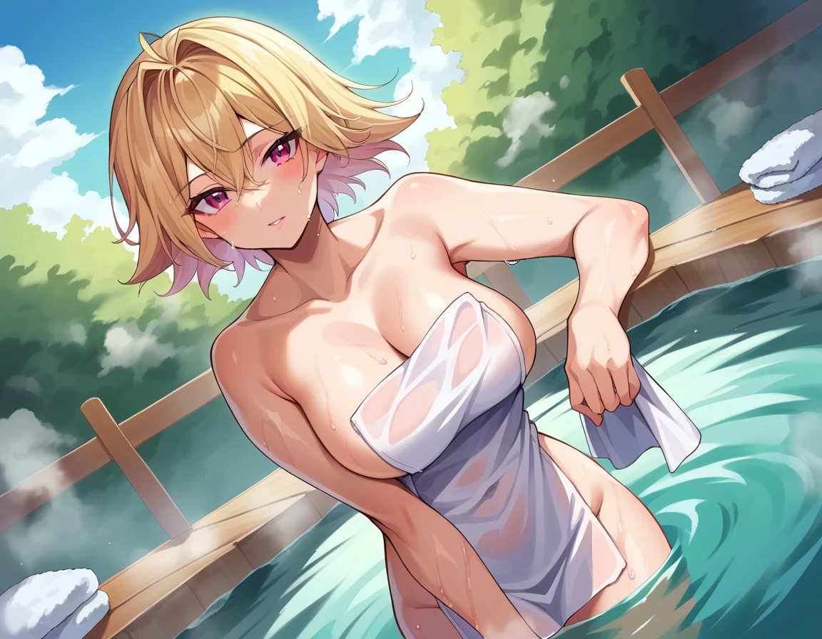 gagaga girl, blonde hair, pink eyes, short hair,
