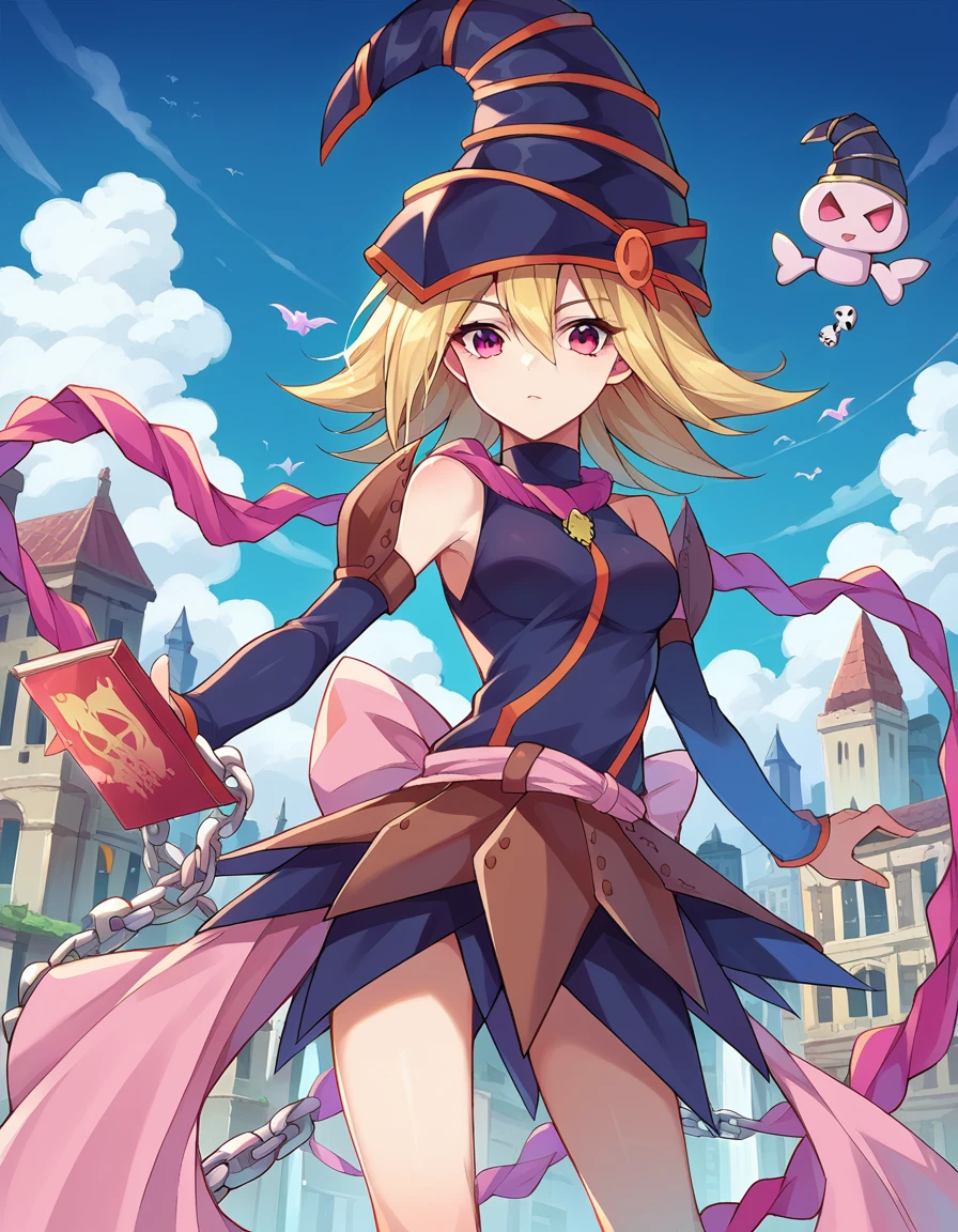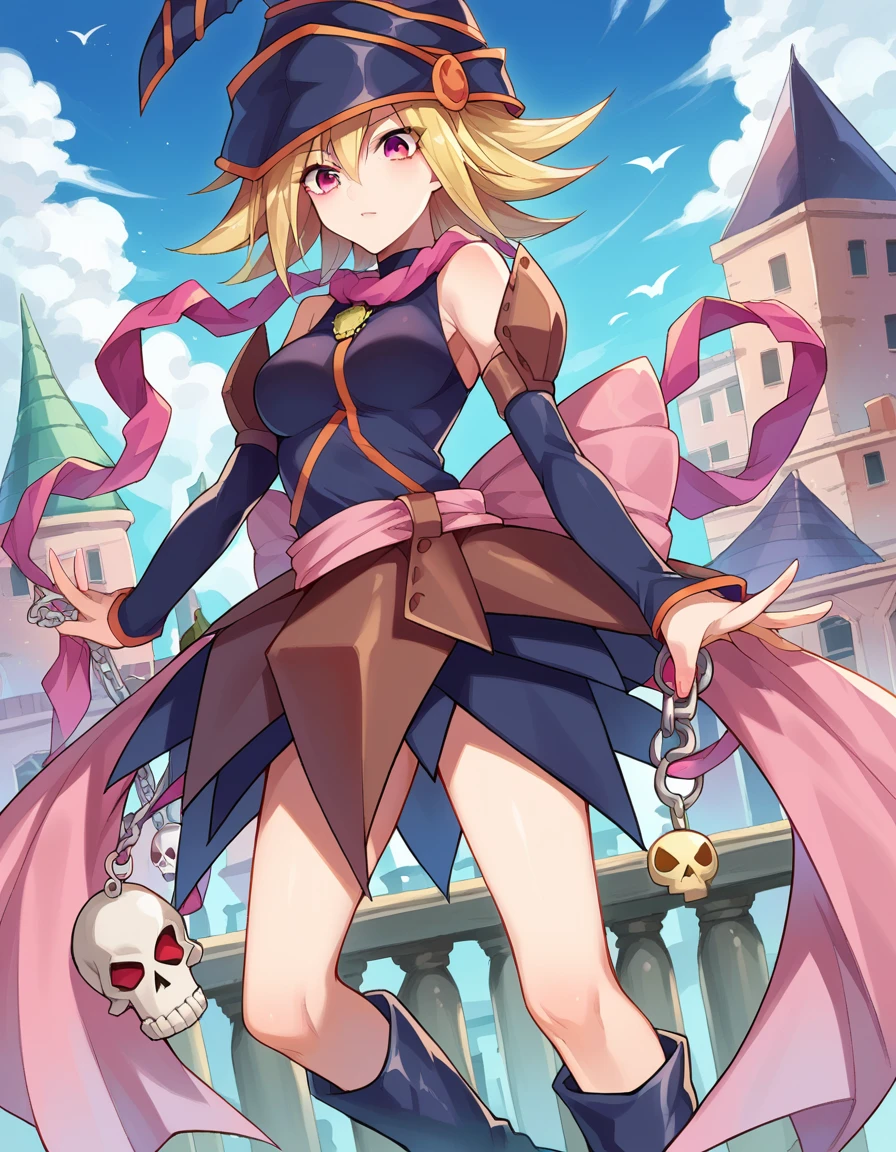 boots, chain, detached sleeves, duel monster, hat, skirt, skull, witch hat, wizard hat, bare shoulders,