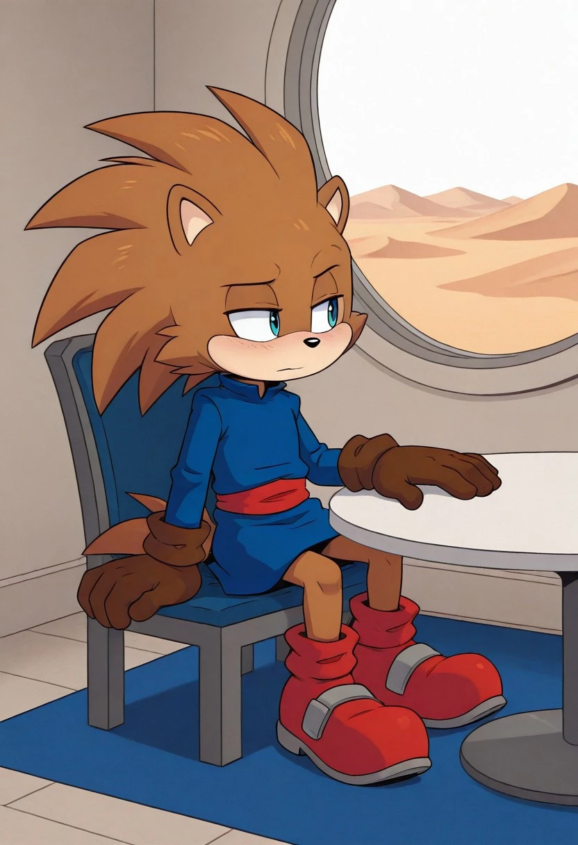 Dylan the Porcupine, brown fur, blue eyes, spiky quills, blue uniform, red sash, red shoes
