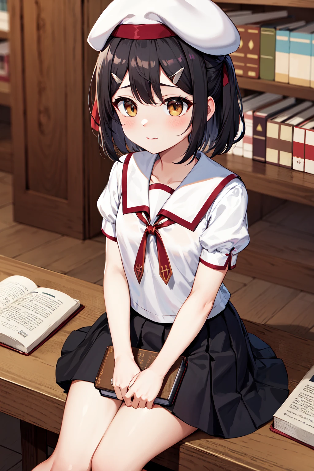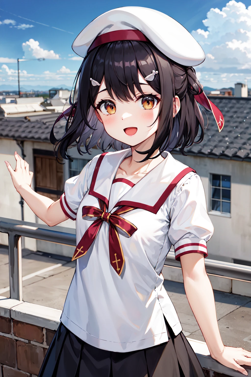 outfit3ccmiyu, short hair, beret, white headwear, hair ornament, small breasts, collarbone, neck ribbon, red ribbon, white sailor collar, white shirt, puffy sleeves, short sleeves, school uniform, pleated skirt, black skirt