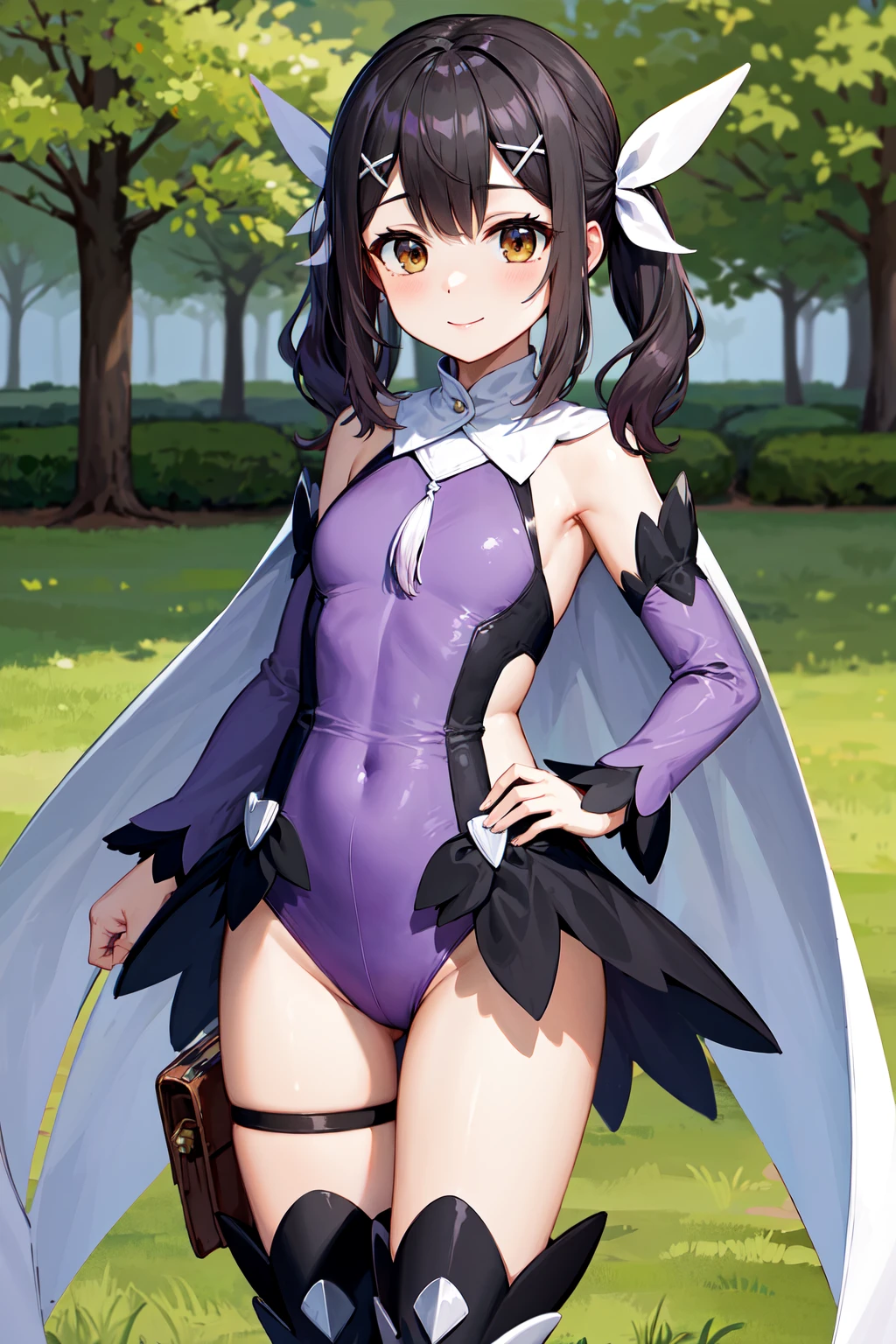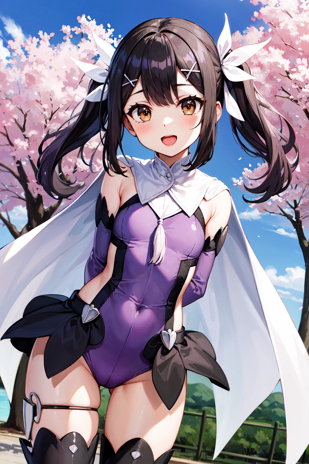 outfit1aamiyu, twintails, hair ribbon, x hair ornament, brown eyes, small breasts, magical girl, white cape, purple leotard, detached sleeves, purple sleeves, showgirl skirt, thigh strap, purple thighhighs