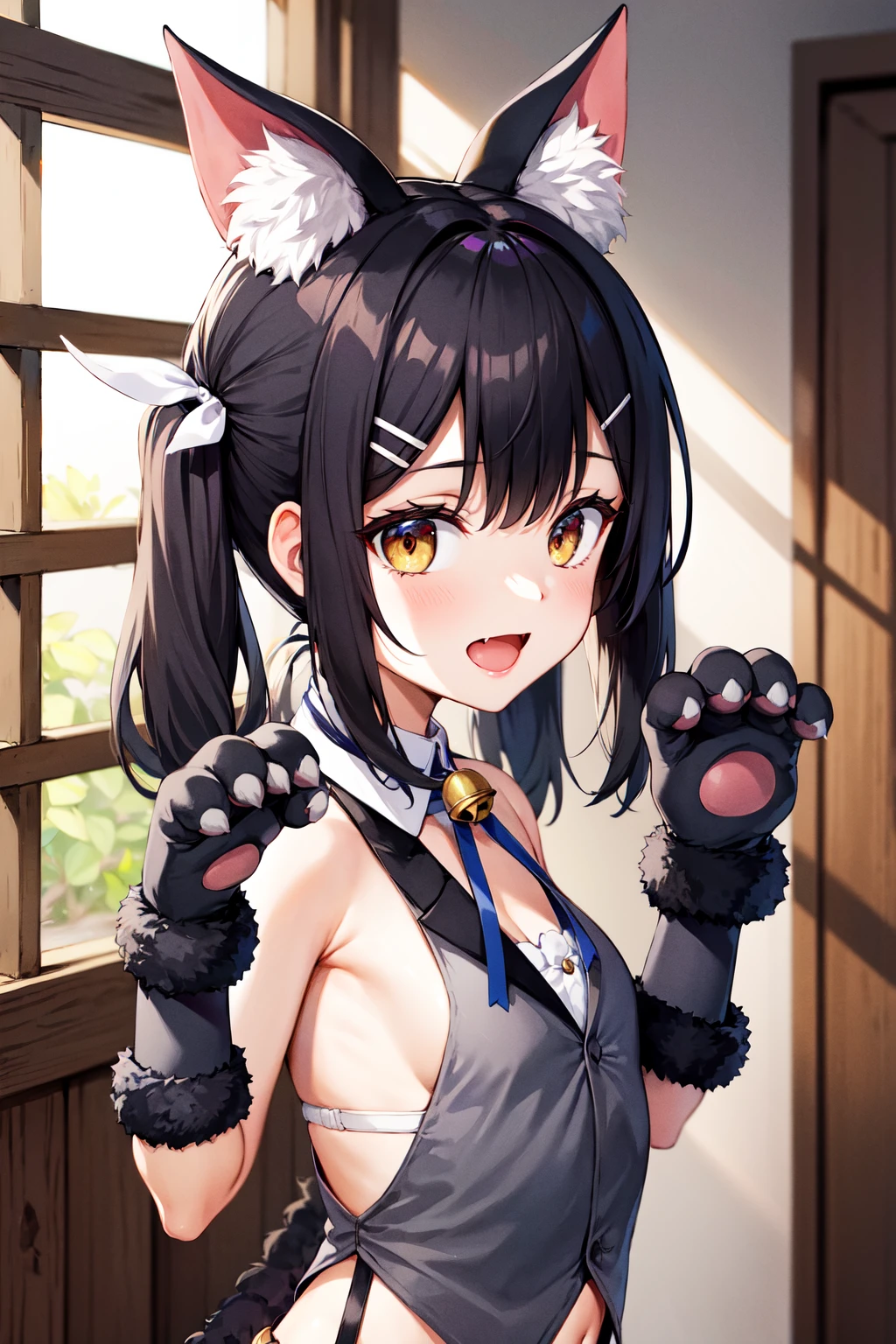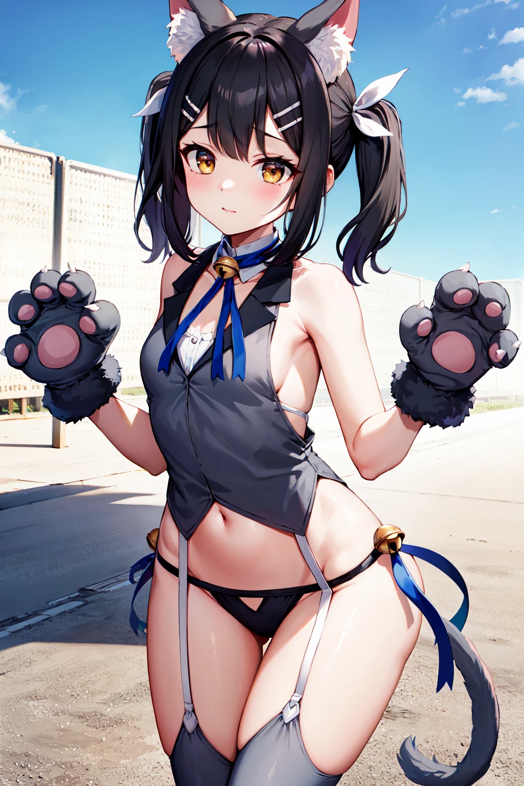 outfit2bbmiyu, twintails, hair ribbon, animal ears, hairclip, small breasts, cat tail, bare shoulders, detached collar, neck ribbon, bell, grey vest, sleeveless, animal hands, paw gloves, black panties, garter straps, grey thighhighs