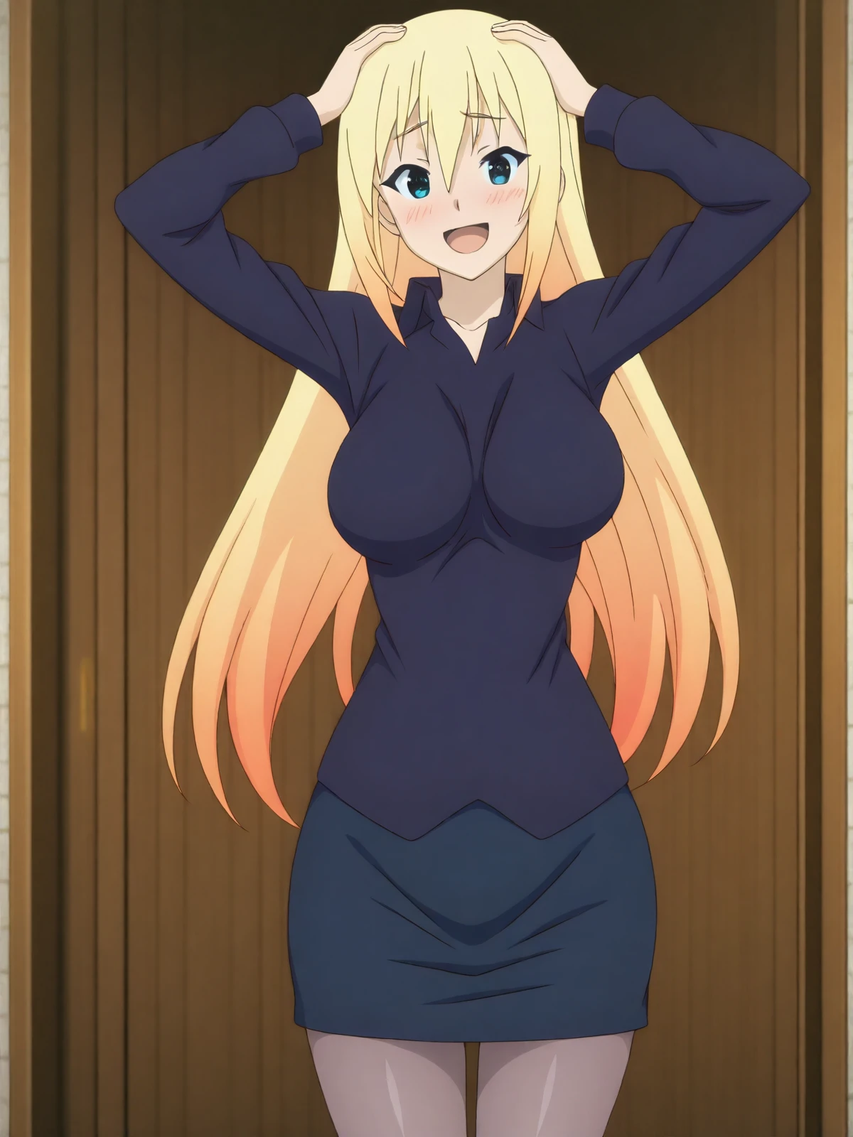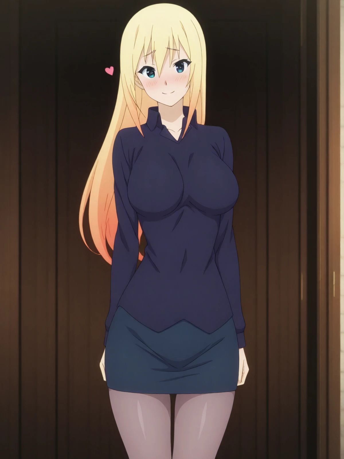 Casual (Hair Down): jv_darkness, 1girl, solo, blonde hair, long hair, blue eyes, fair skin, large breasts, hair down, dark blue shirt, long sleeves, fitted shirt, dark blue skirt, pencil skirt, pantyhose, no ribbon