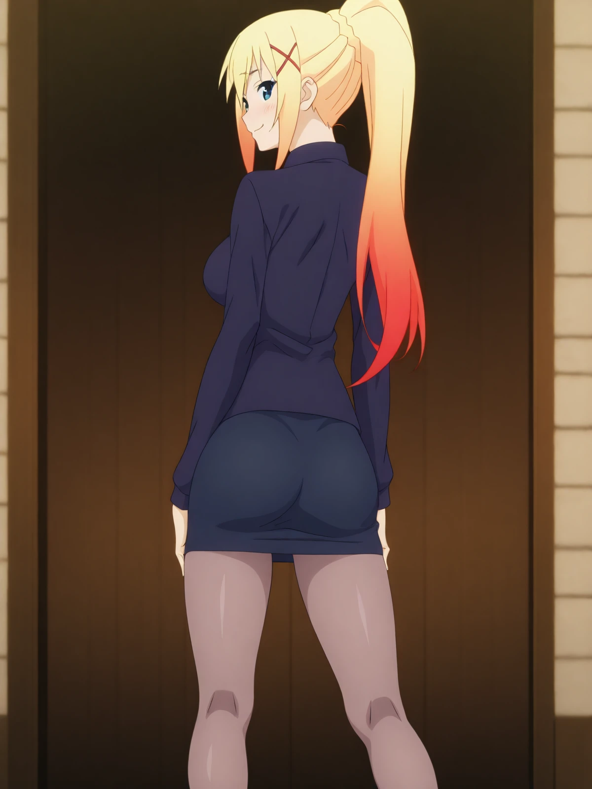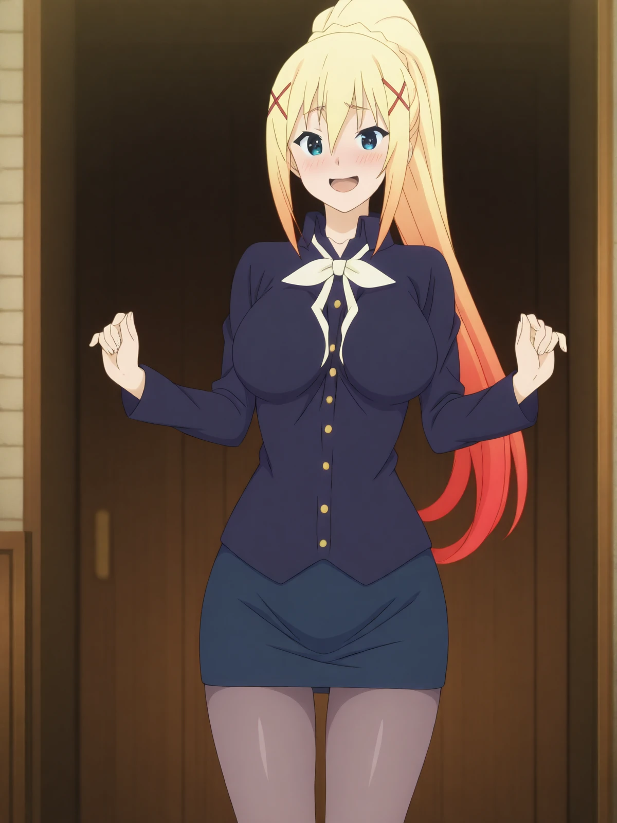 Casual (Ponytail): jv_darkness, 1girl, solo, blonde hair, long hair, blue eyes, fair skin, large breasts, high ponytail, x hair clip, red hair clip, white ribbon, dark blue shirt, long sleeves, fitted shirt, gold buttons, dark blue skirt, pencil skirt, pantyhose