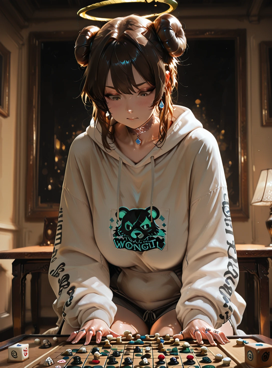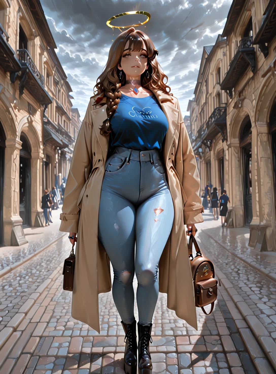 Daria, woman, long thick wavy brown hair, hazel eyes, curvy, golden halo, small silver hoop earrings, delicate rings, lace choker with a silver pendant.
