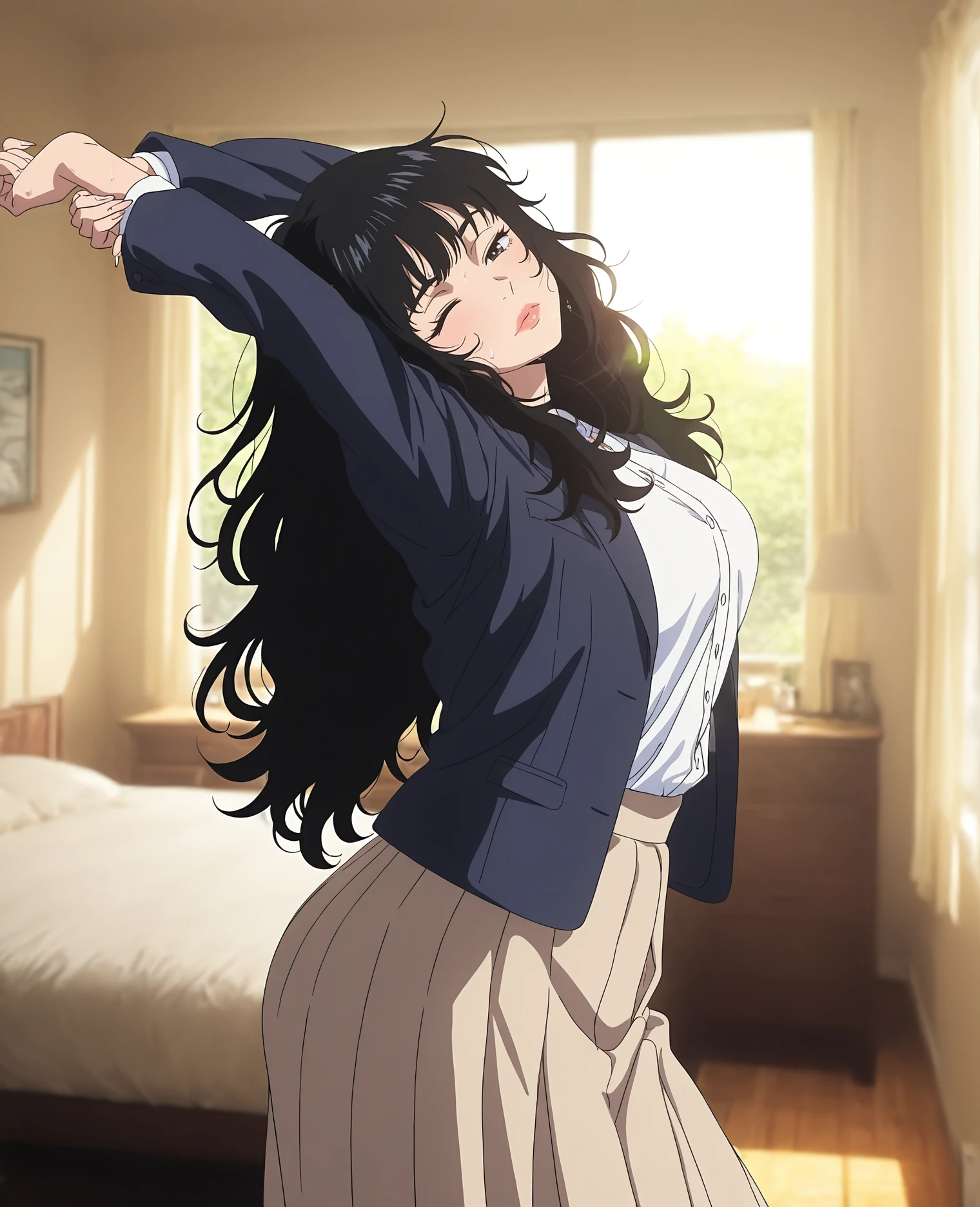 saya, long hair, black hair, long hair, white shirt, long skirt, open blazer