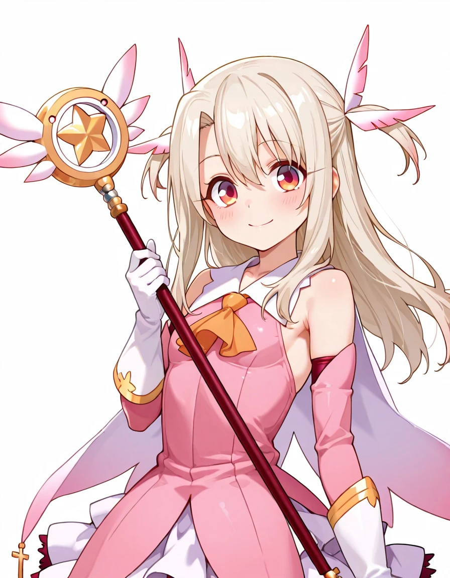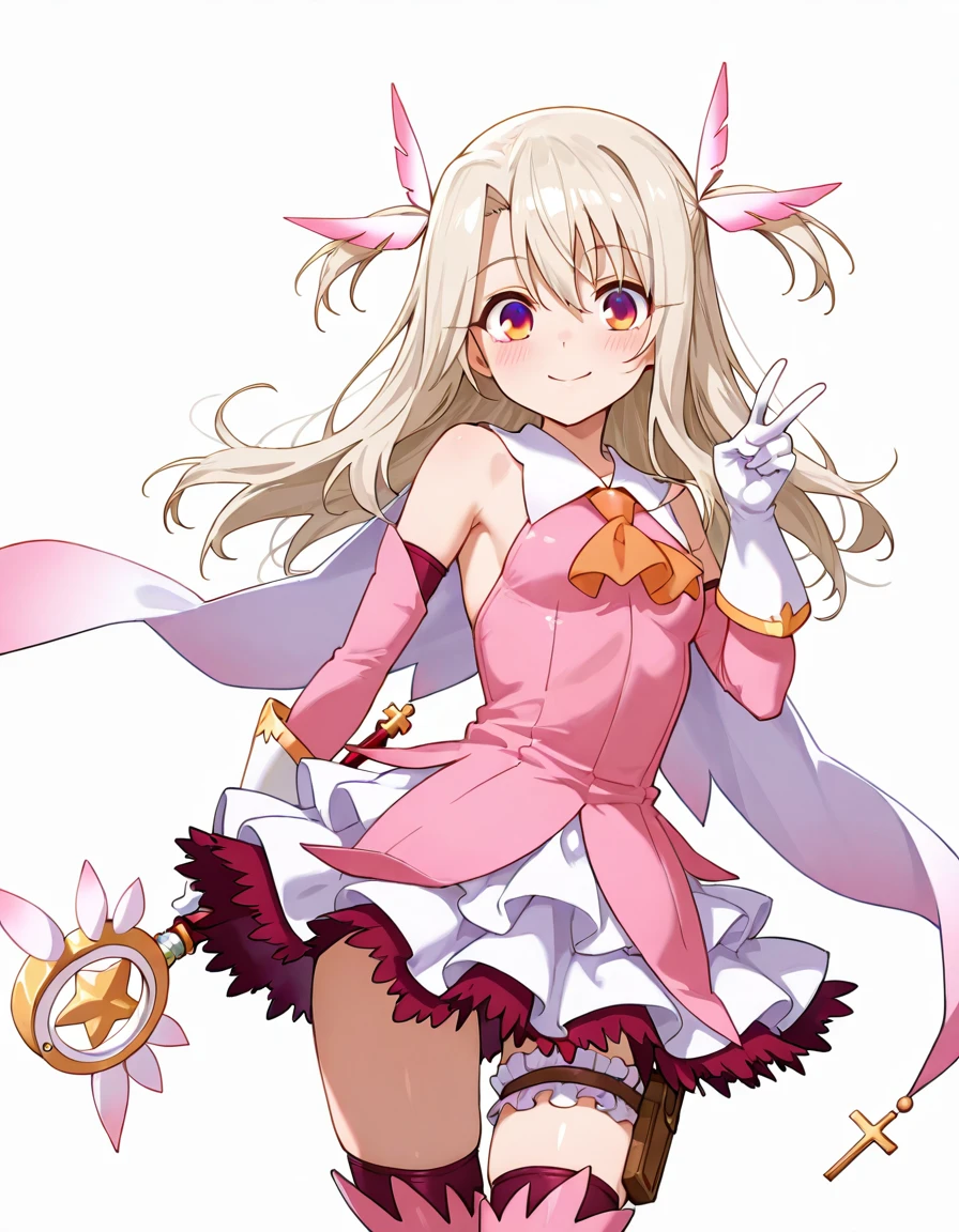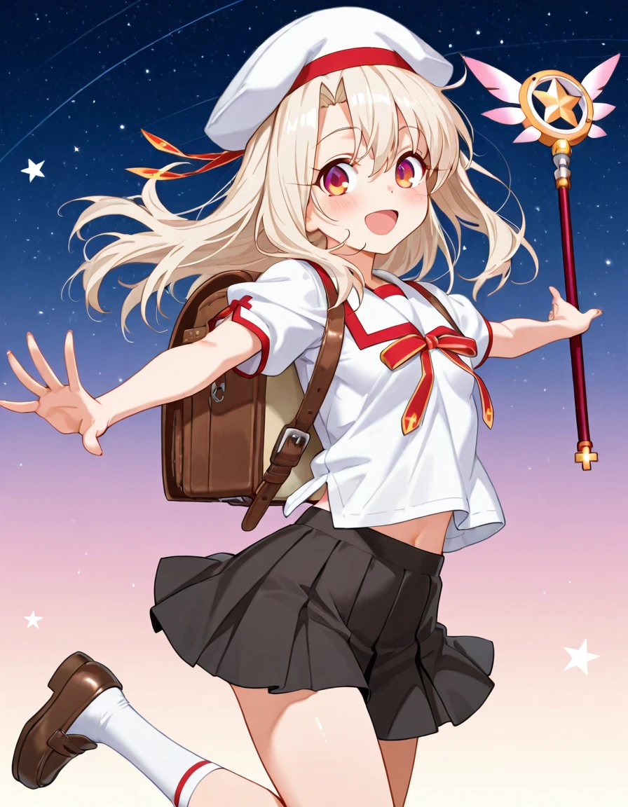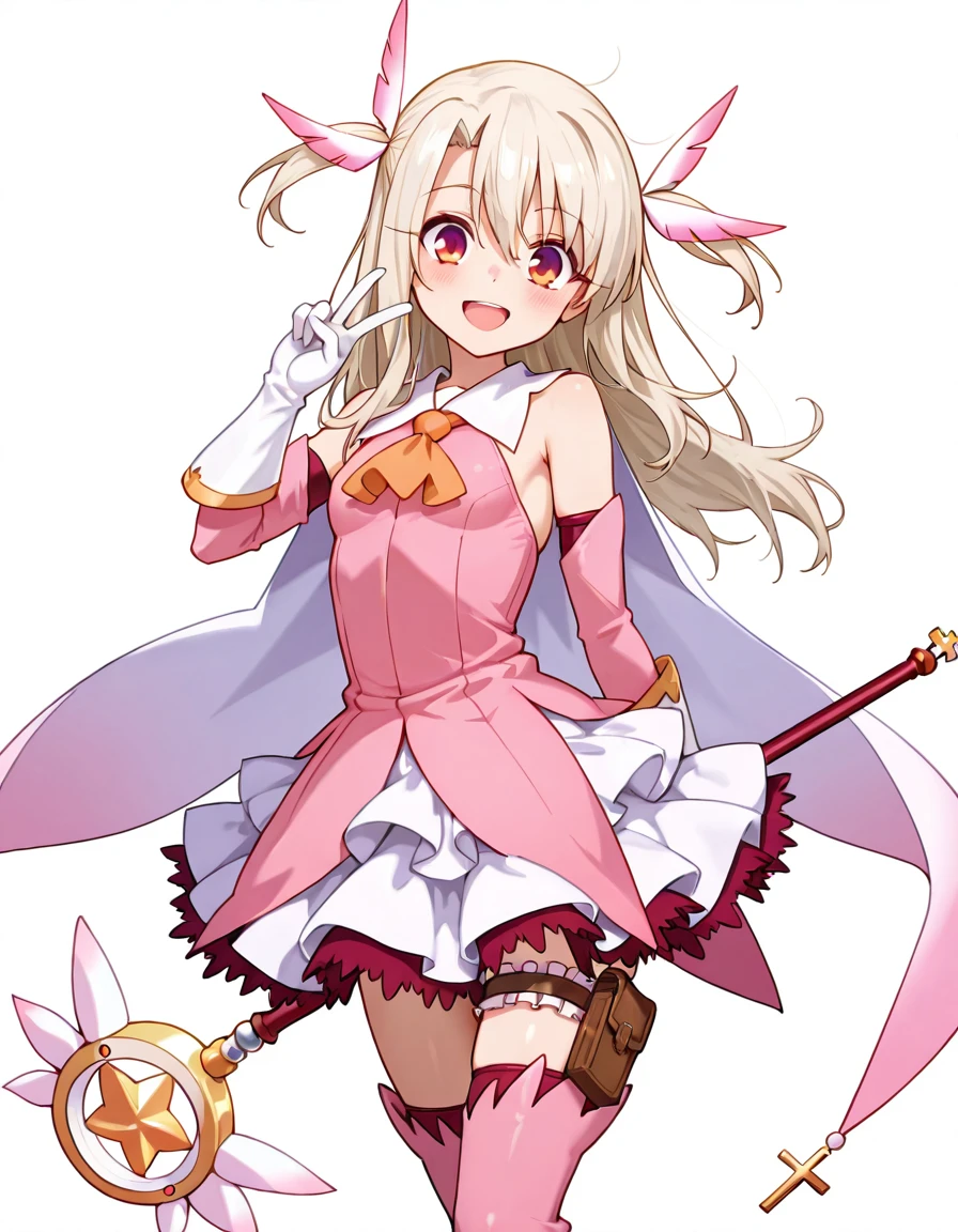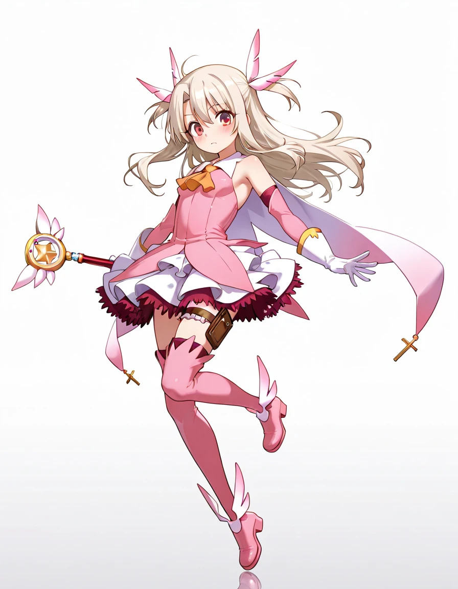 PrismaIllya,two side up, prsm_dress, prsm_elbow_gloves, prsm_feather_hair_ornament, prsm_detached_sleeves, prsm_thighhighs, prsm_bridal_garter, prsm_thigh_boots, prsm_ascot, prsm_layered_skirt, magic wand, magical ruby, cross ornament, prsm_capeSchool Uniform: