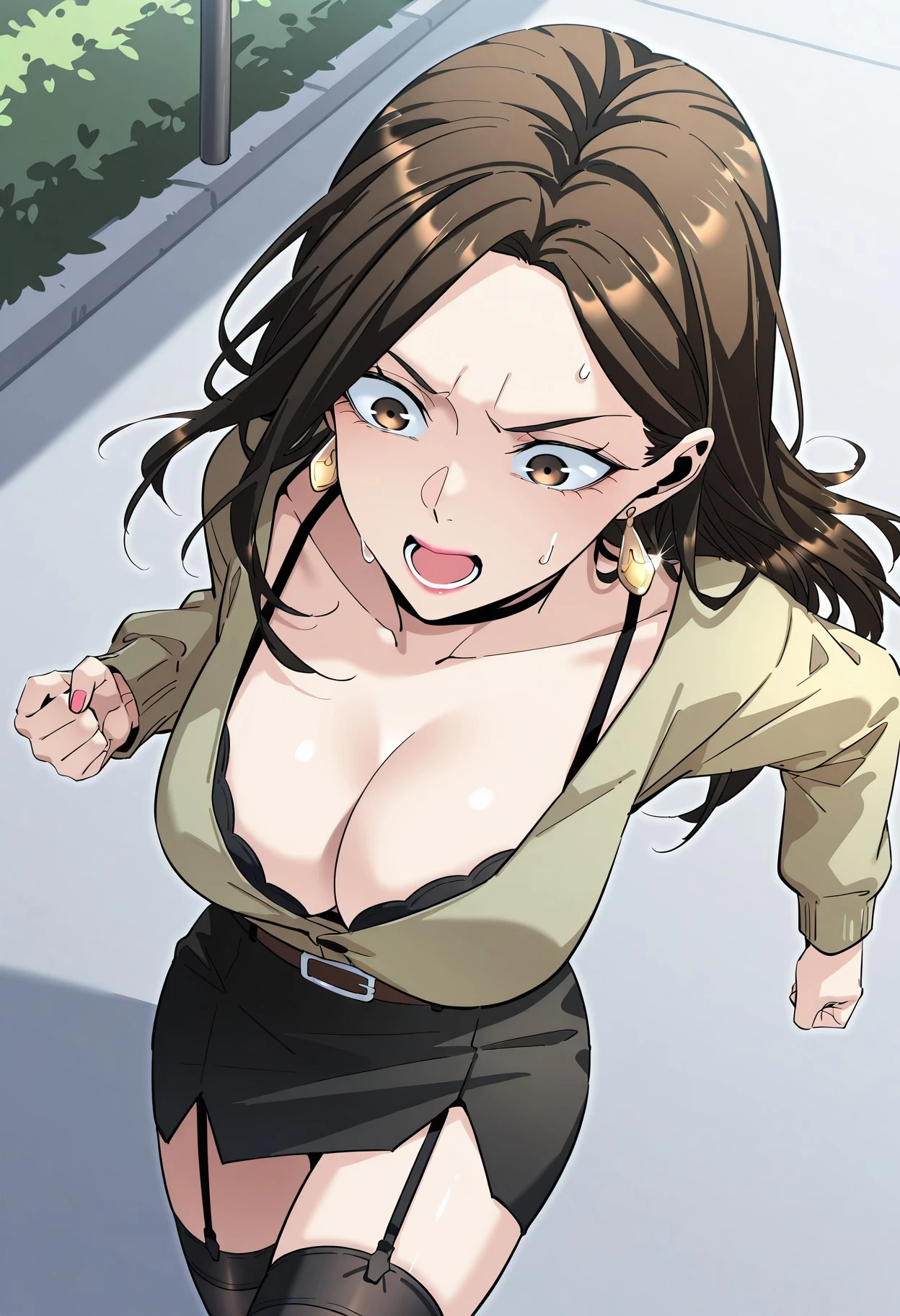 Default_outfit, light olive green cardigan, 2 black buttons in front, exposed cleavage, (black bra underneath:0.7), black shoulder strap visible, roomy top, roomy sleeves, tucked in cardigan, dark brown belt, short pencil skirt, black skirt, black thighhighs, black garter straps, brown shoulder bag,