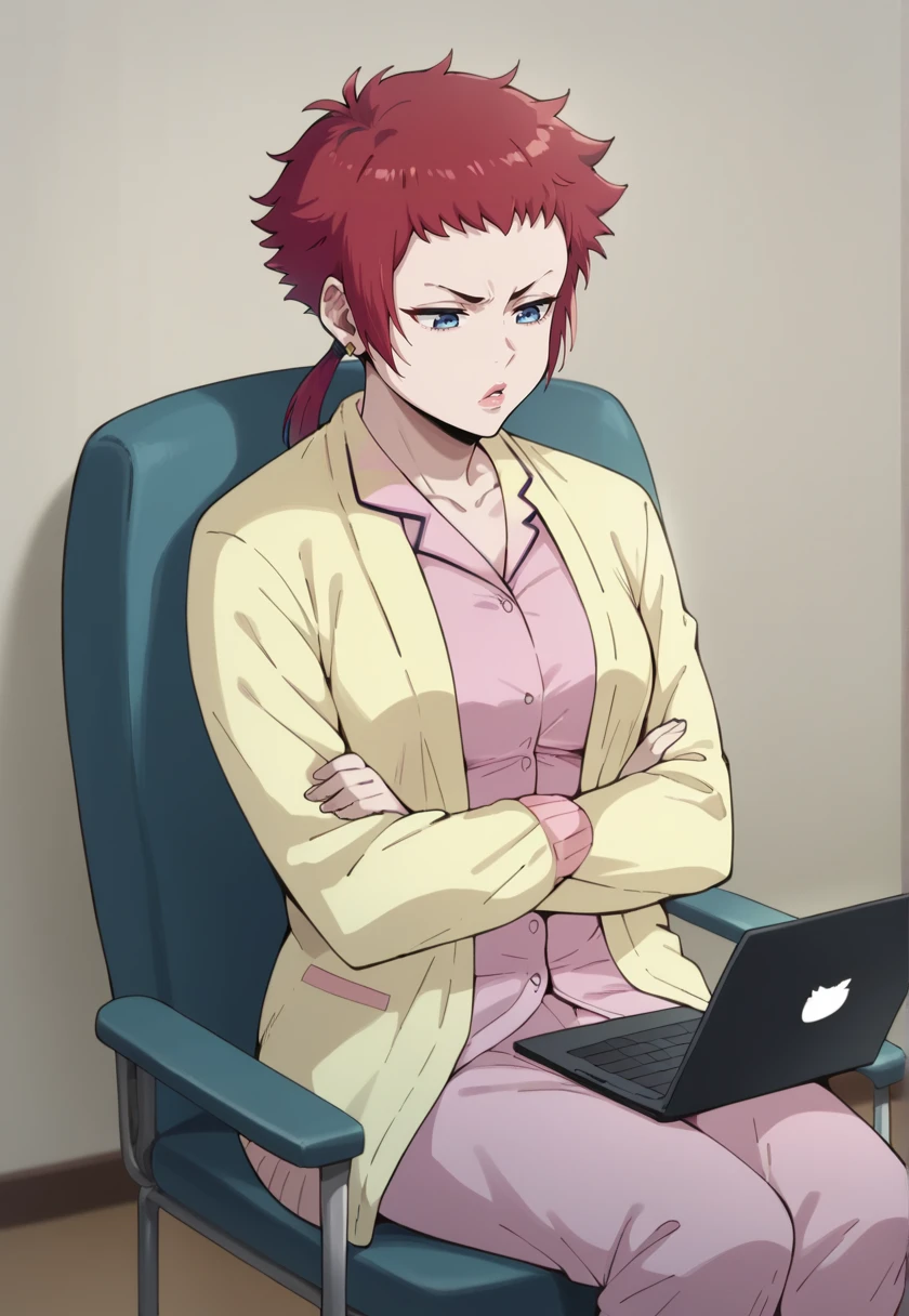 EmmaPajamas, pink pants, pajamas, pink shirt, parted lips, chair, yellow cardigan, open clothes, long sleeves