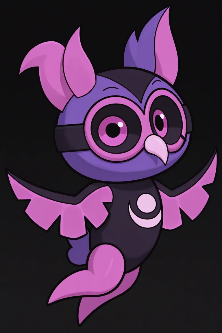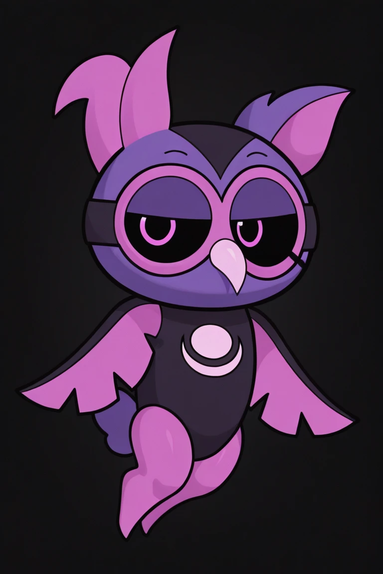 kepler_ca, owl, pink eyes, black sclera, purple body, wings, non-human,pink legs, asymmetrical ears, chibi
