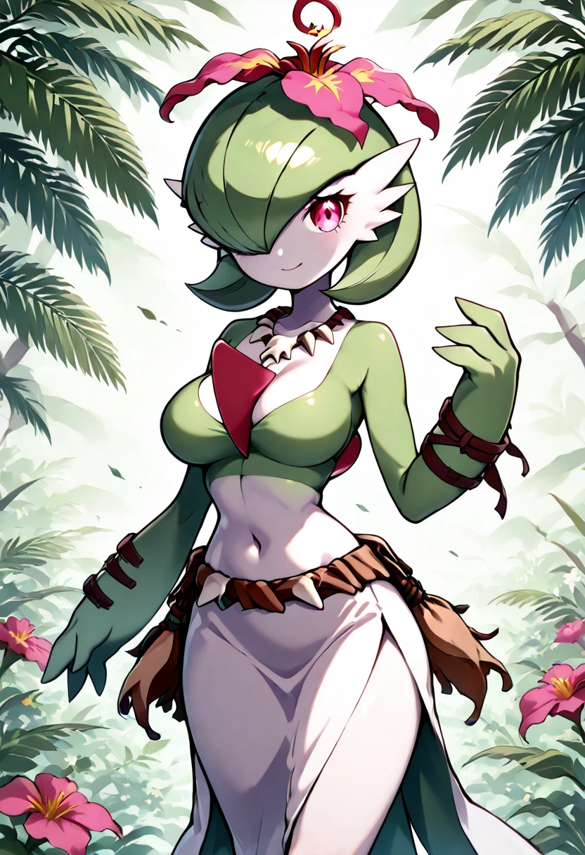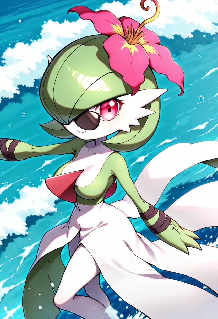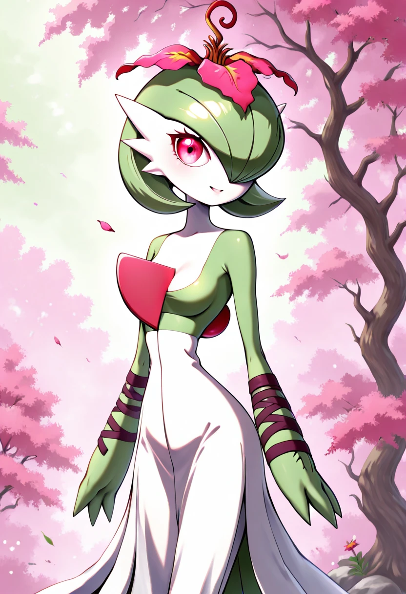 PaldevoirC1tr0n, pink eyes, green hair, short hair, bob cut, hair flower, pink flower, white skin, green skin, multicolored skin, two-tone skin, arm wraps, white dress, green dress, multicolored dress,