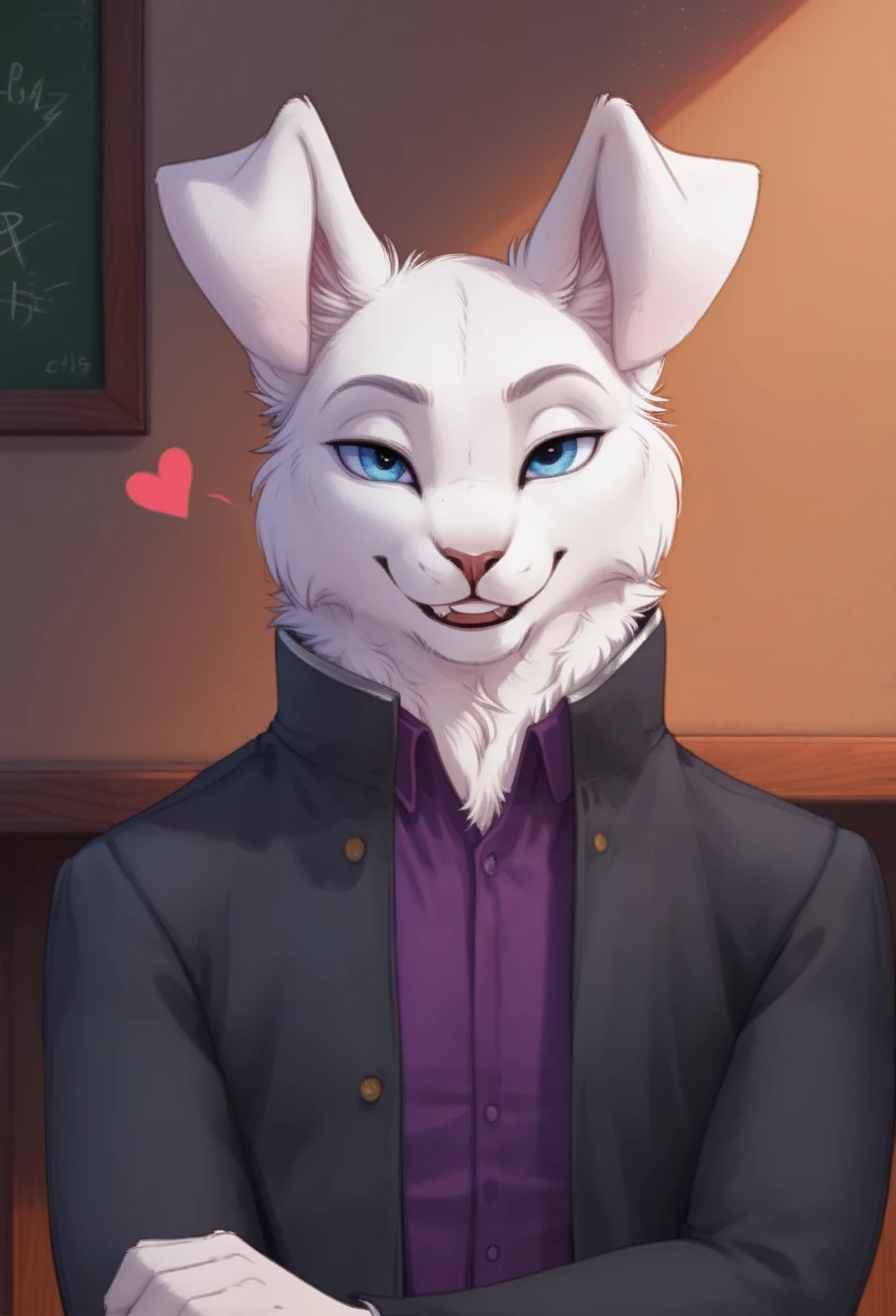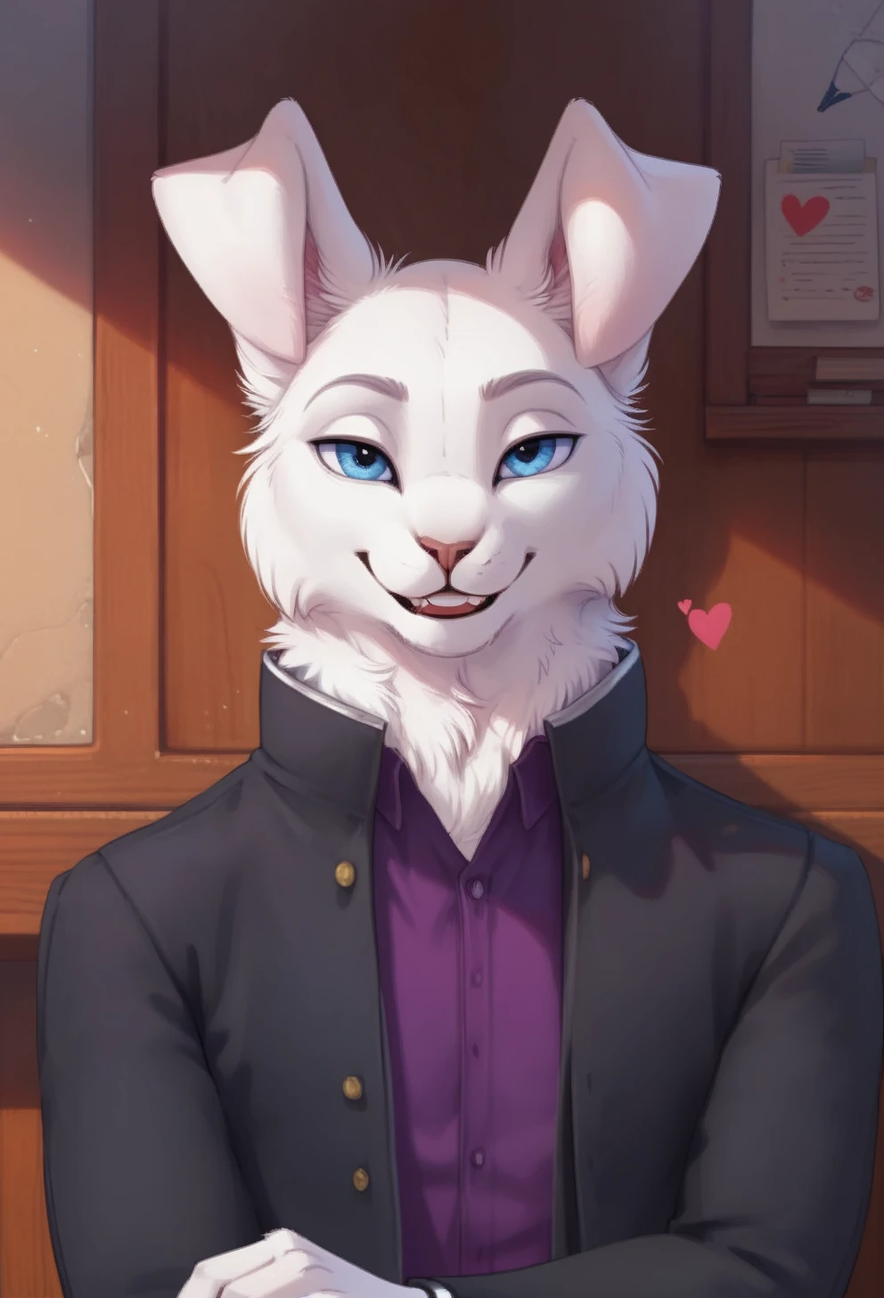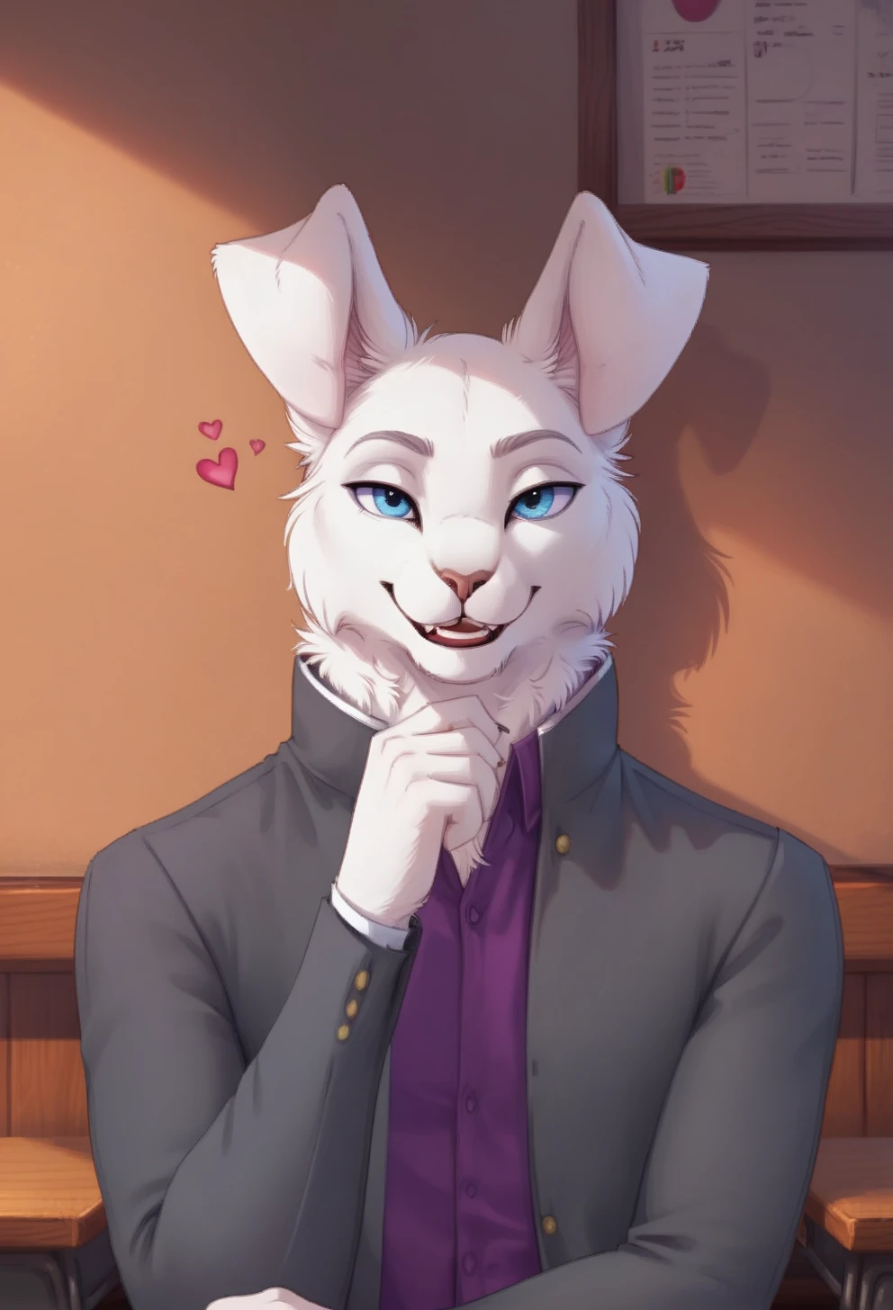 bedroom eyes, detailed eyes, perfect eyes, beautiful eyes, , detailed fur, tail, eyes, realistic fur, , solo, 1 boy, young, (((handsome, detailed face and eyes))), rabbit, solo, detailed fluffy fur , realistic blue eyes, neck fluff, blue eyes, extremely detailed eyes, anthro rabbit, athletic, , buck teeth, rabbit teeth, sexy, tail, eyes focus, anthro hands, detailed anthro hands, detailed fluffy fur, white fur, grey jacket, purple shirt under jacket, school uniform, , clothing, bedroom, floppy ears, pure white fur,