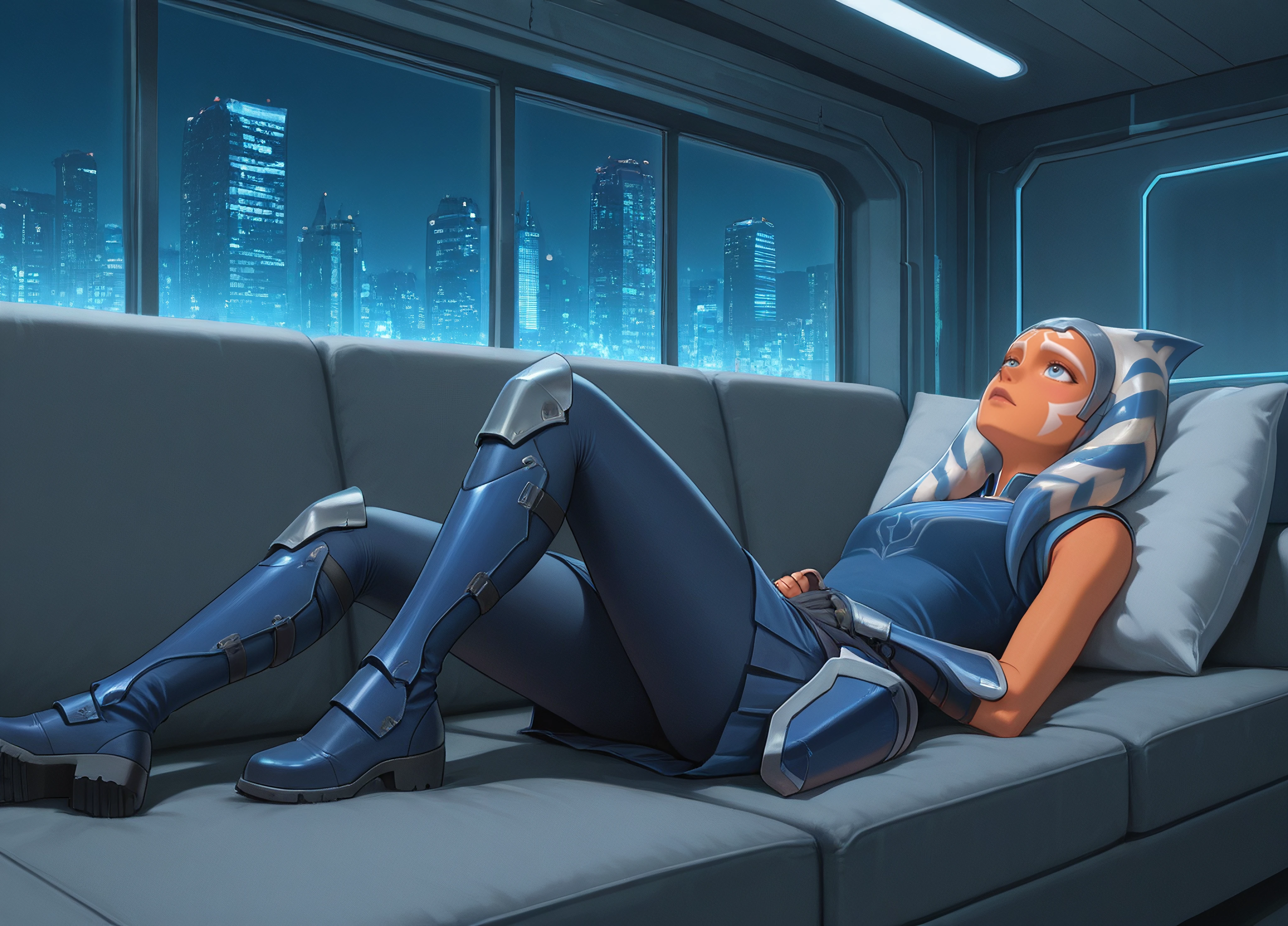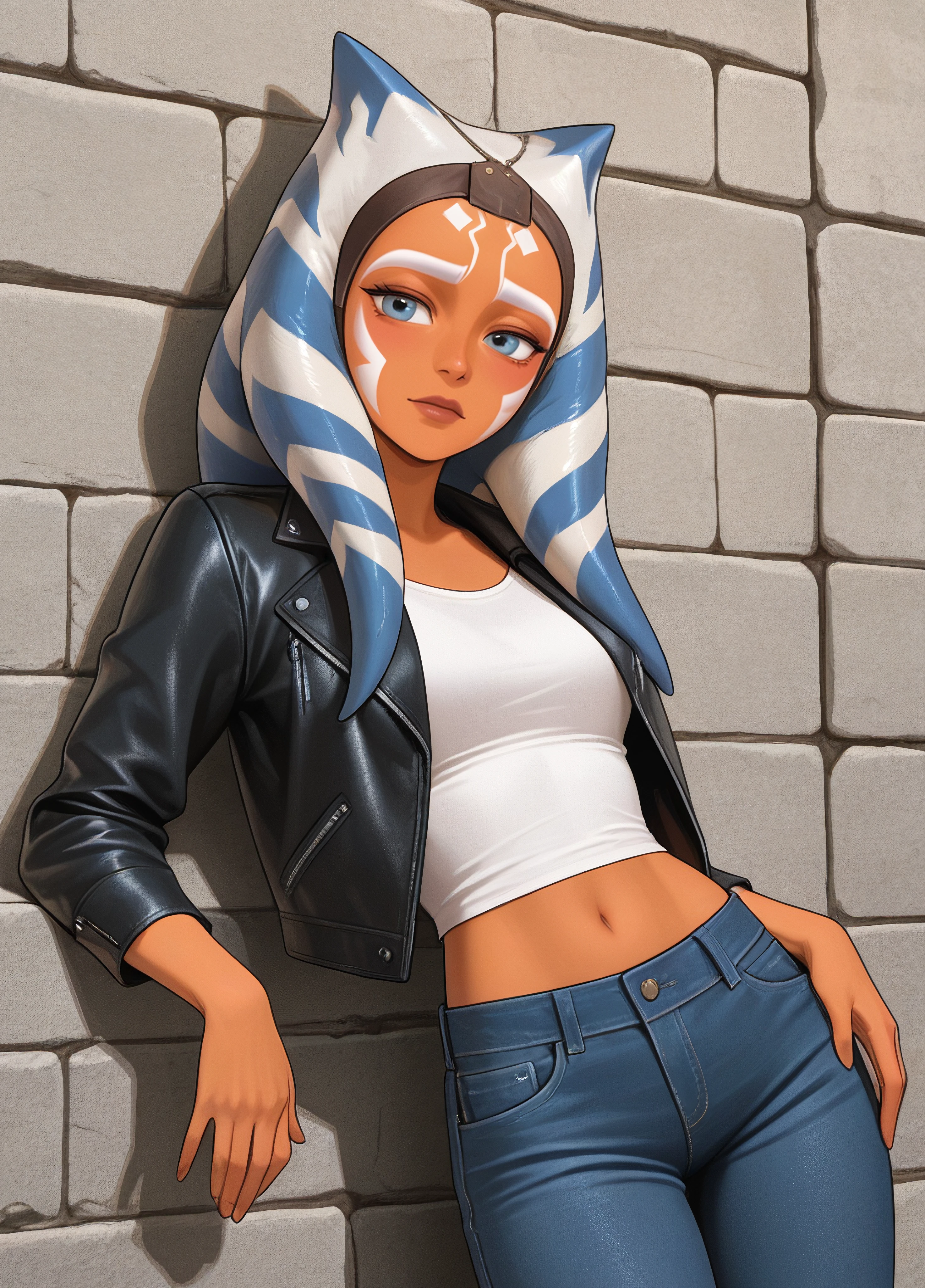 Ahsoka Tano, orange skin, blue eyes, face markings, montrals, lekku
