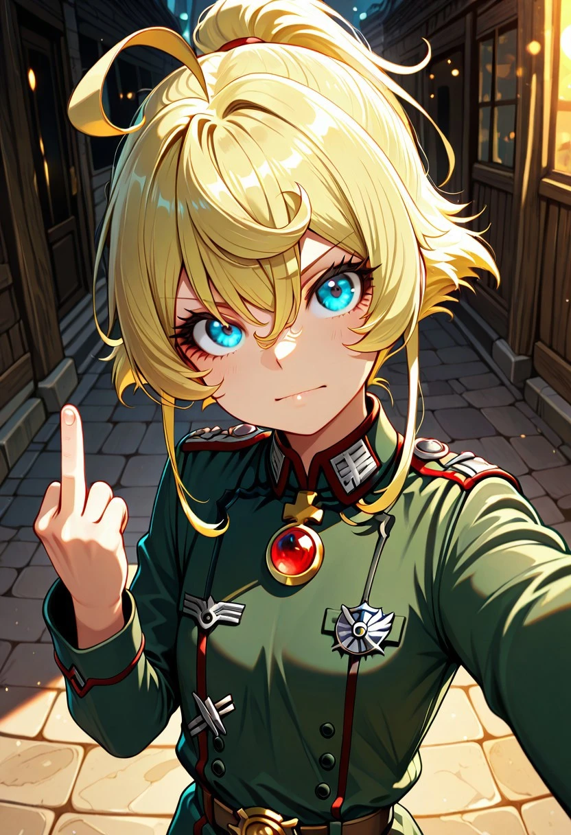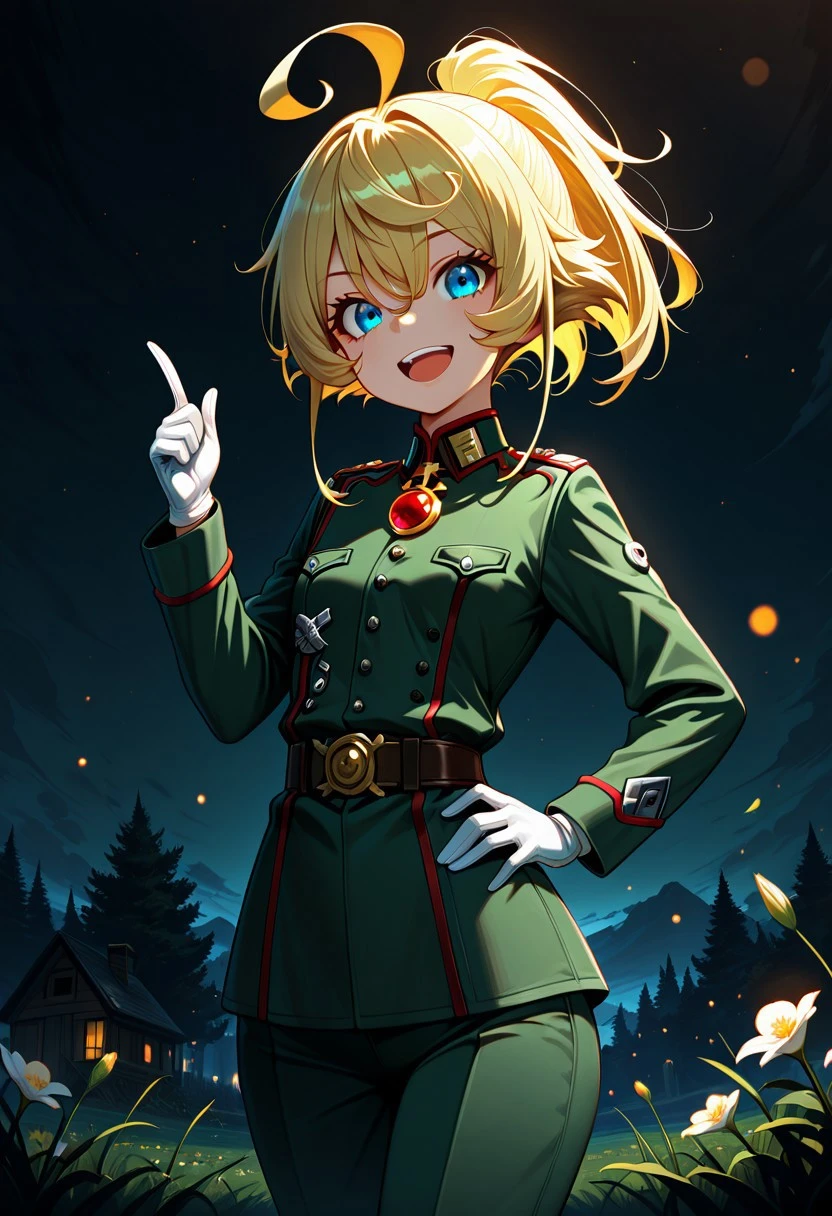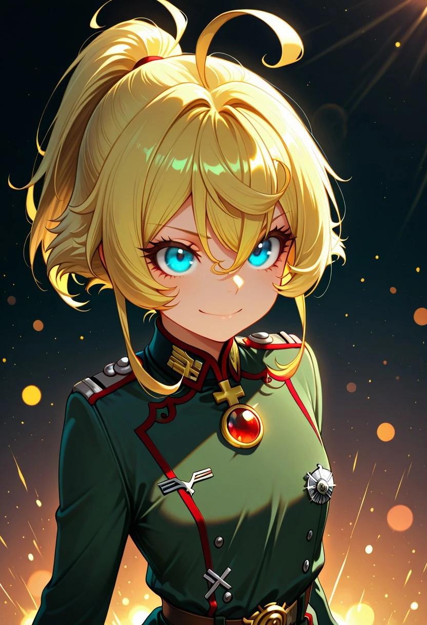 Character appearance: blonde hair, high ponytail, antenna hair, hair between eyes, short hair with long locks, sidelocks, ahoge, bangs, blue eyes, tiny breasts
