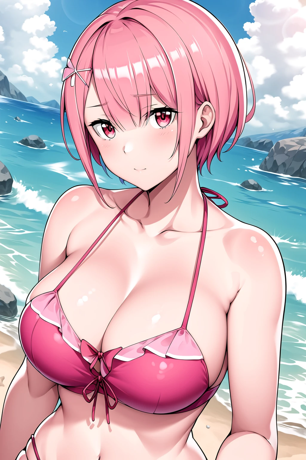 Red eyes, Pink hair,bangs,Short hair,one eye covered, hair ornament,