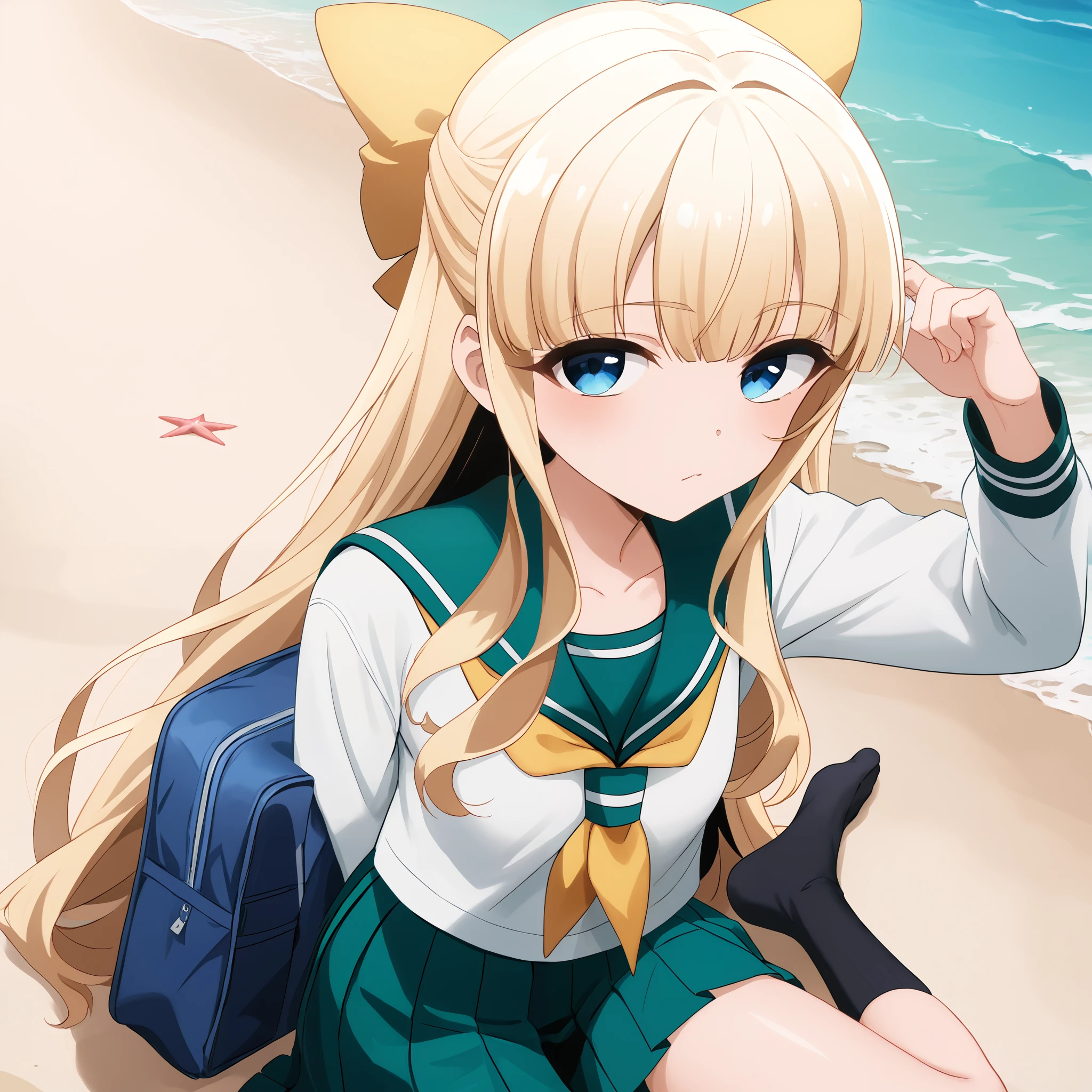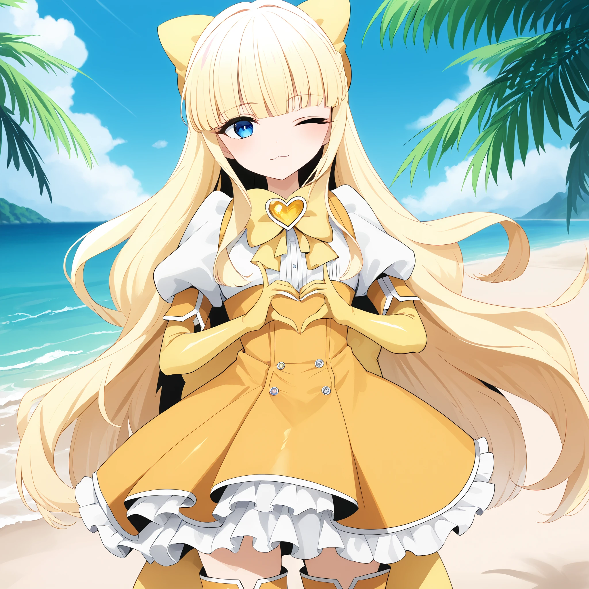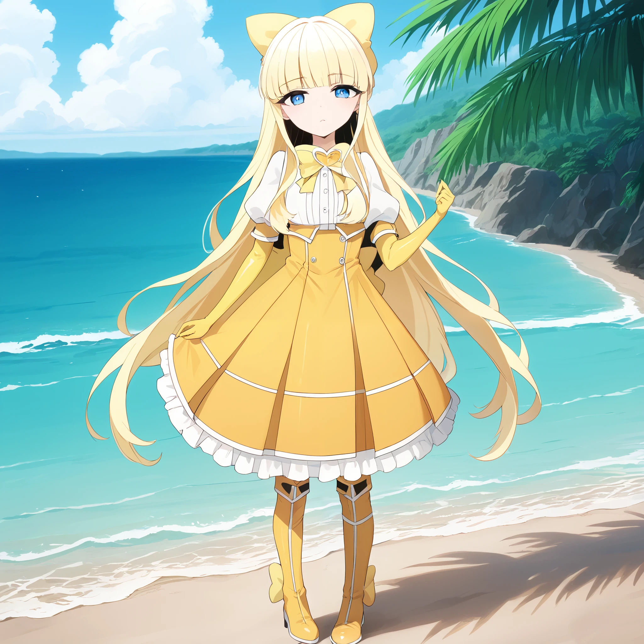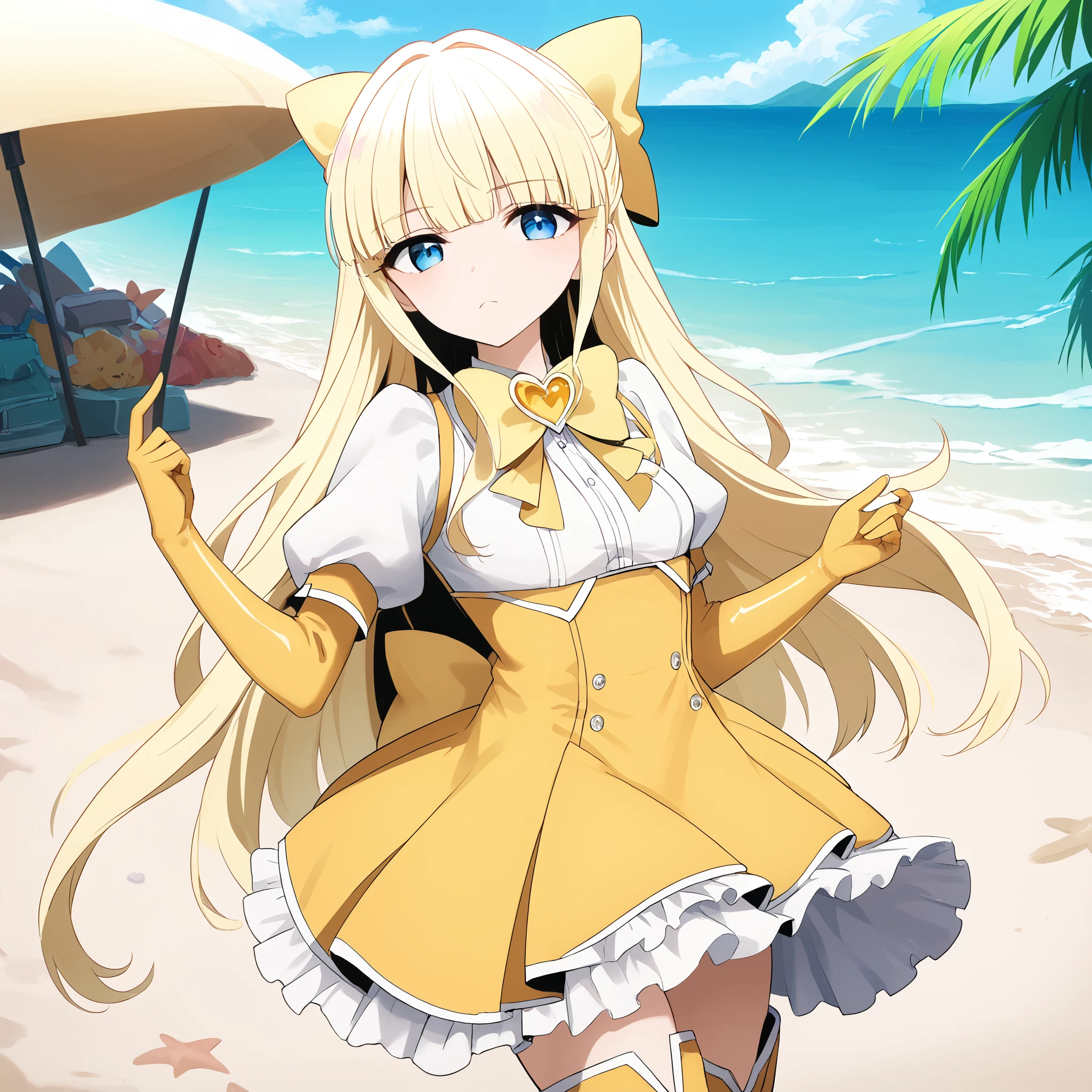 Magical Girl Uniform : tenkawa kaoruko, blonde hair, blue eyes, long hair, magical girl, hair bow, yellow bow, yellow dress, yellow bowtie, puffy short sleeves, white sleeves, elbow gloves, yellow gloves, yellow skirt, high-waist skirt, frilled skirt, thigh boots, yellow footwear,Description