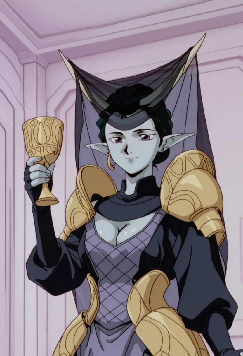 horns, veil, armored dress, shoulder armor, breasts, cleavage, cleavage cutout, fingerless gloves,