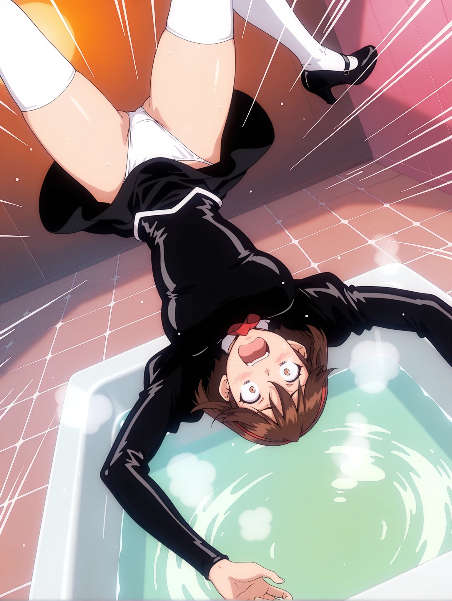 衣装ワード ・d_clothes,red ascot,puffy sleeves,long_sleeves,black dress,white underwear,white thighhighs,black high heels,