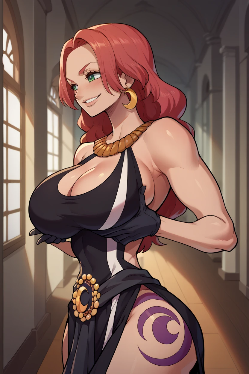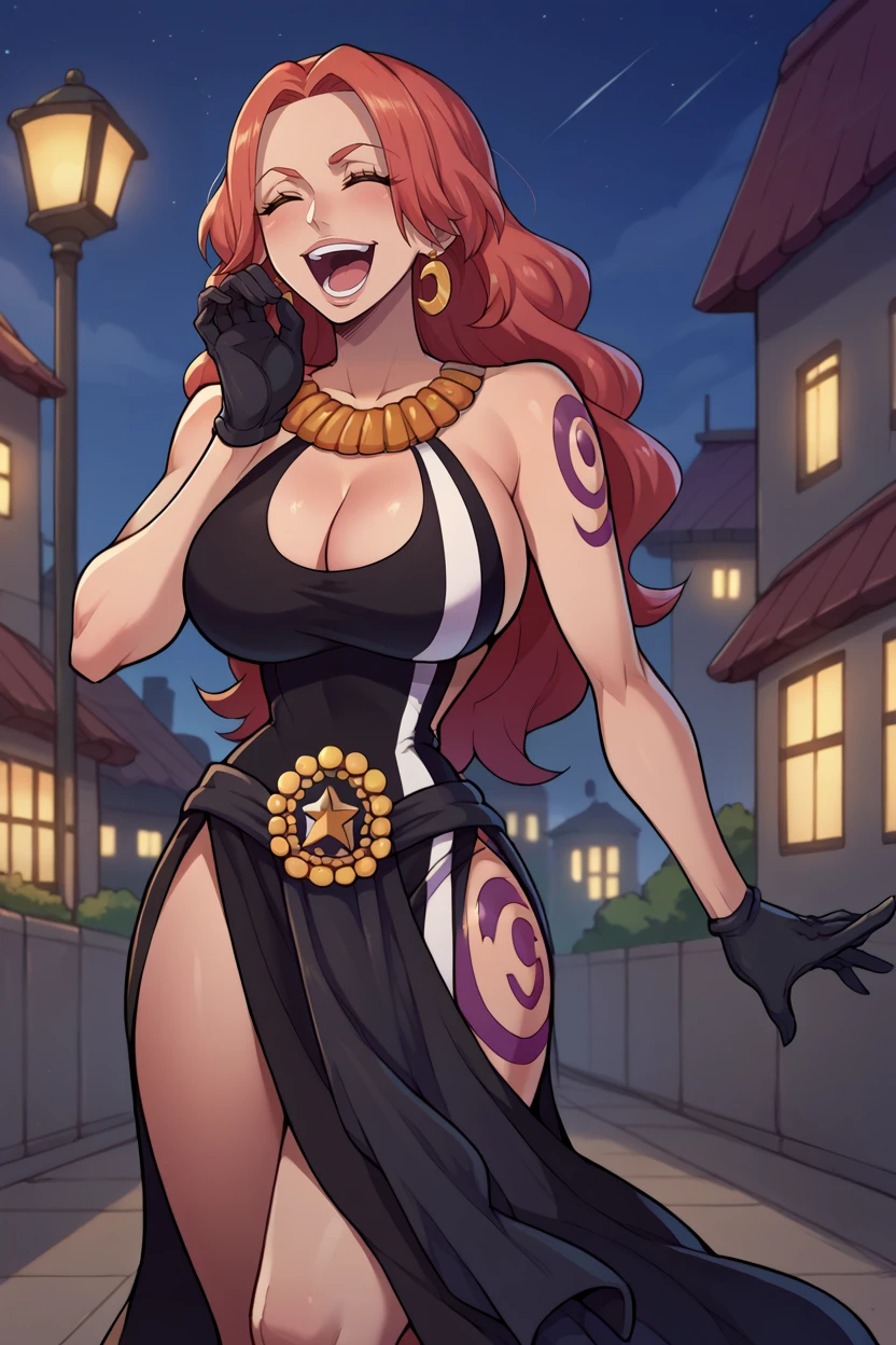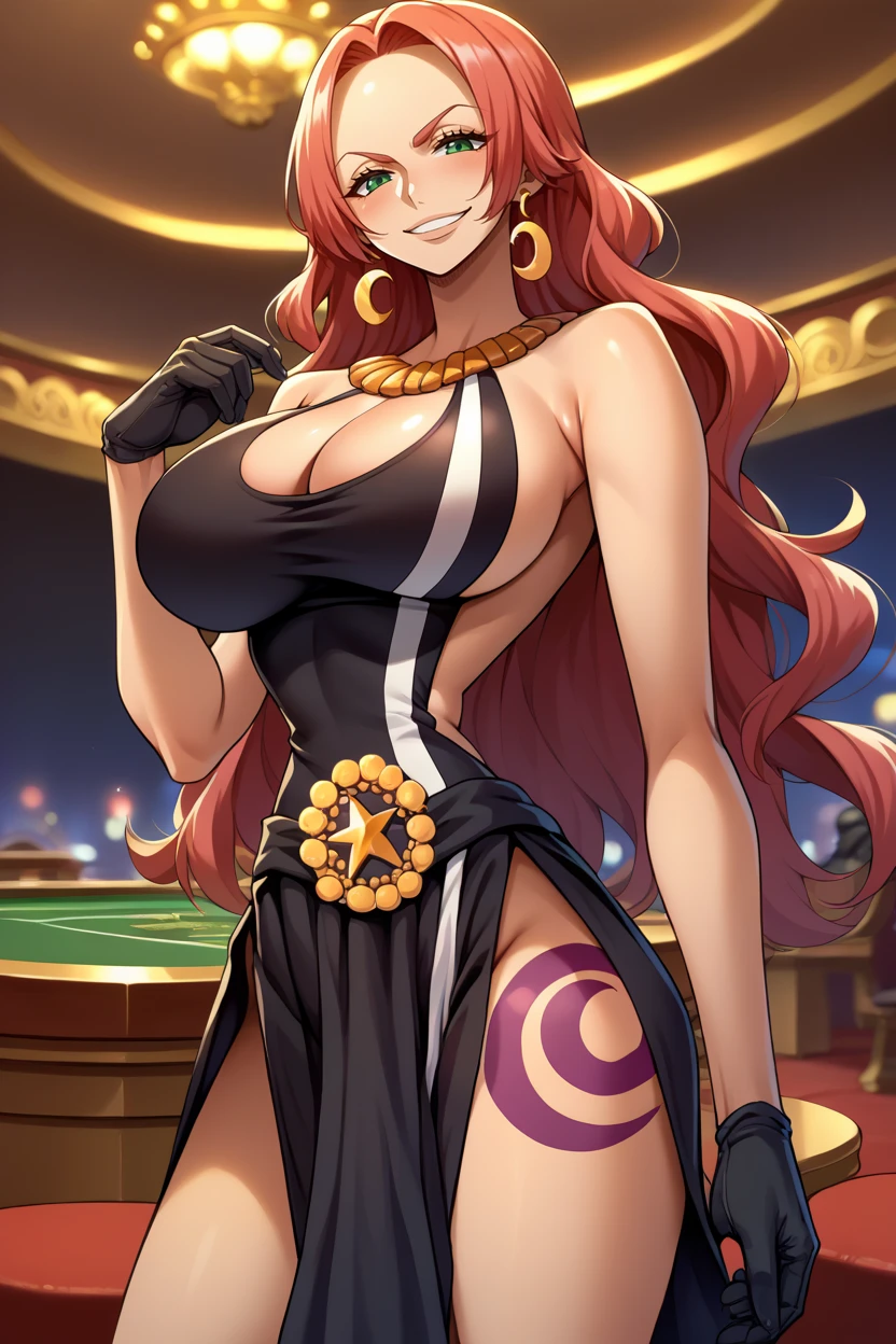 Add "earrings, necklace, black dress, cleavage cutout, long dress, black gloves, thigh tattoo" for her typical look.