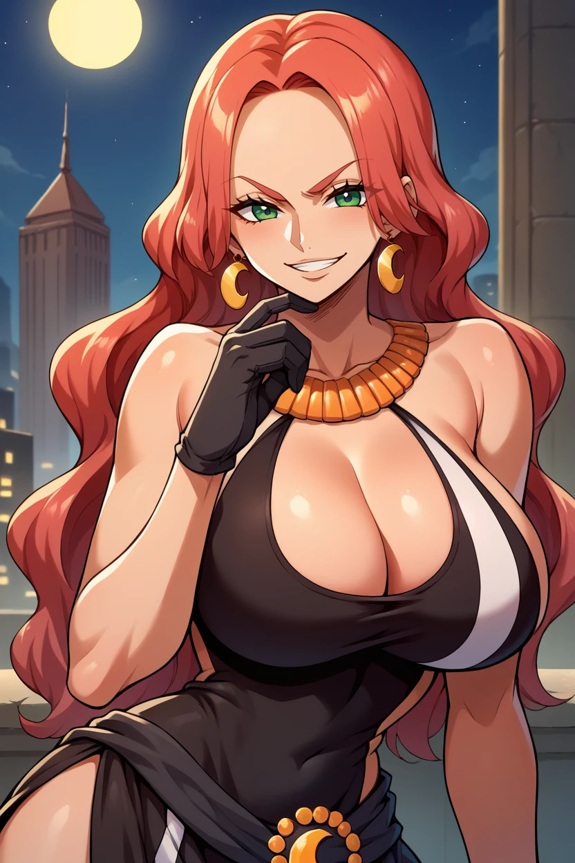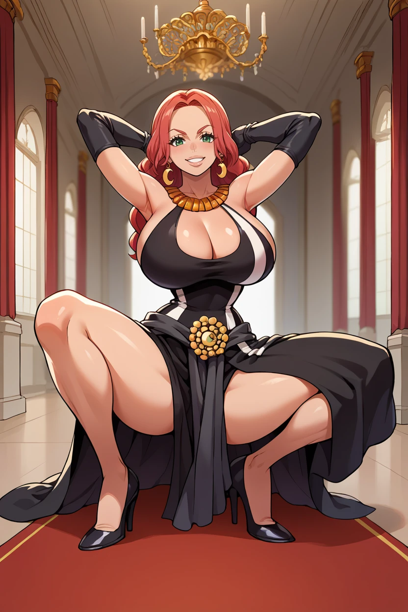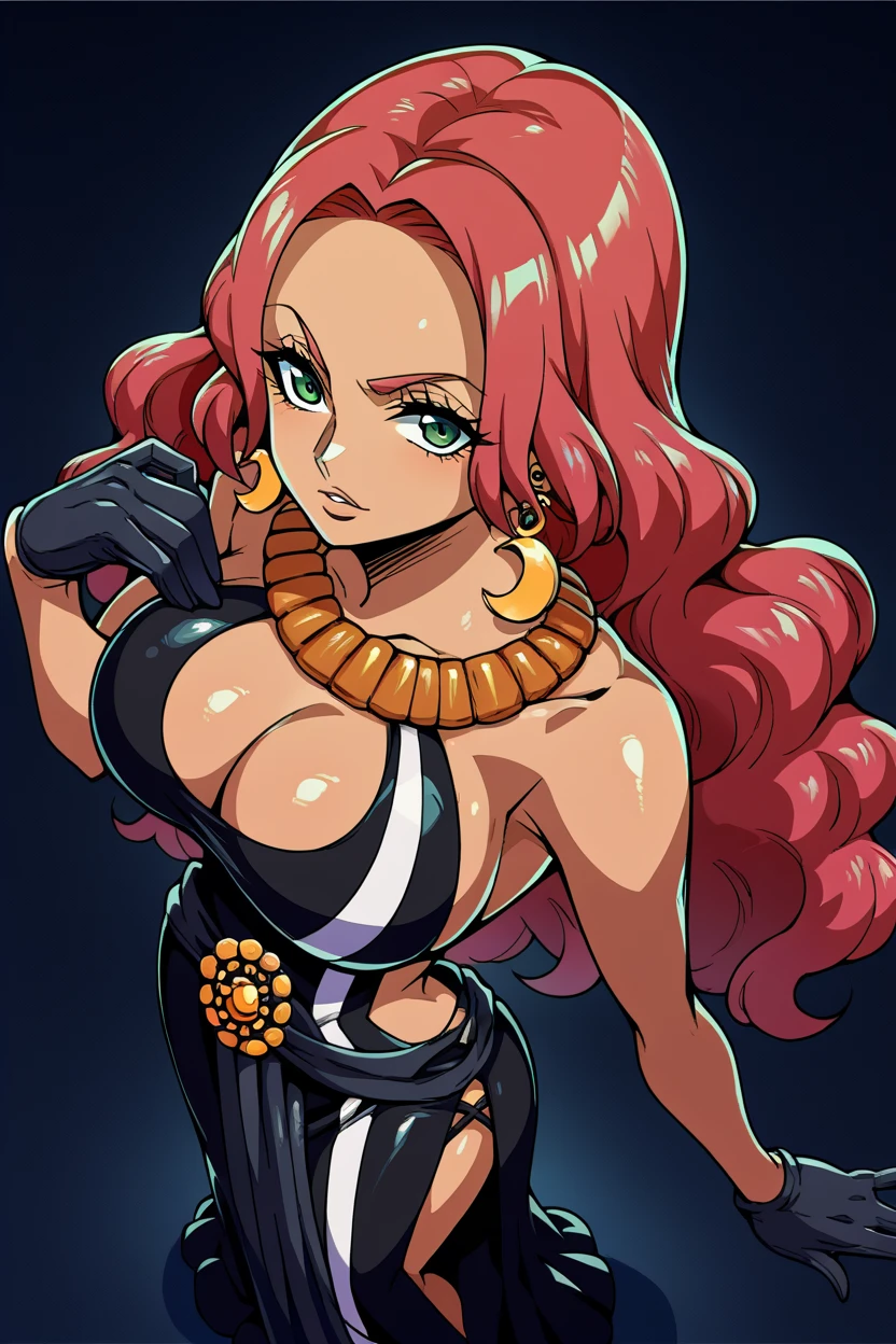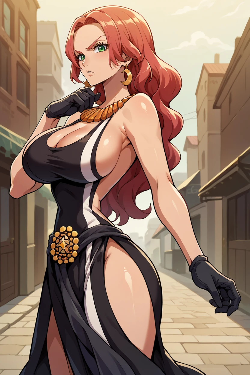 Add "earrings, necklace, black dress, cleavage cutout, long dress, black gloves, thigh tattoo" for her typical look.