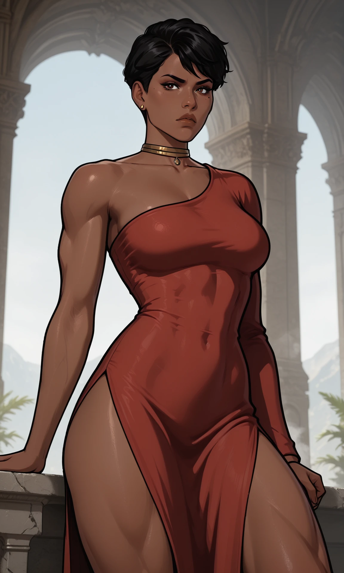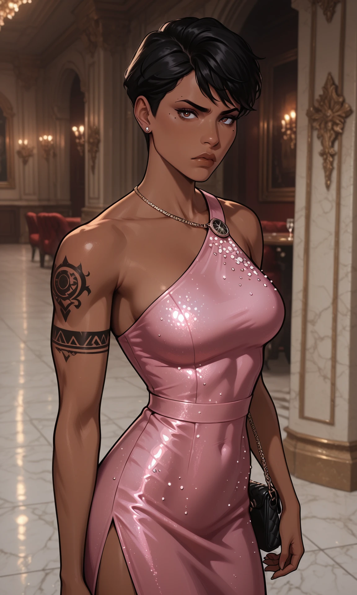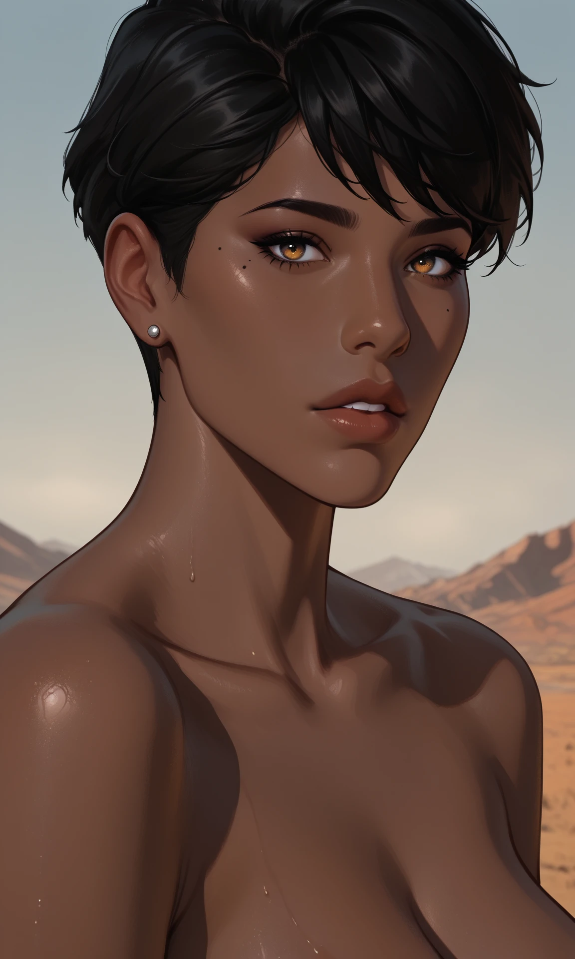 zara khan, dark-skinned female, short hair, black hair, earrings, very dark skin, mole below right eye