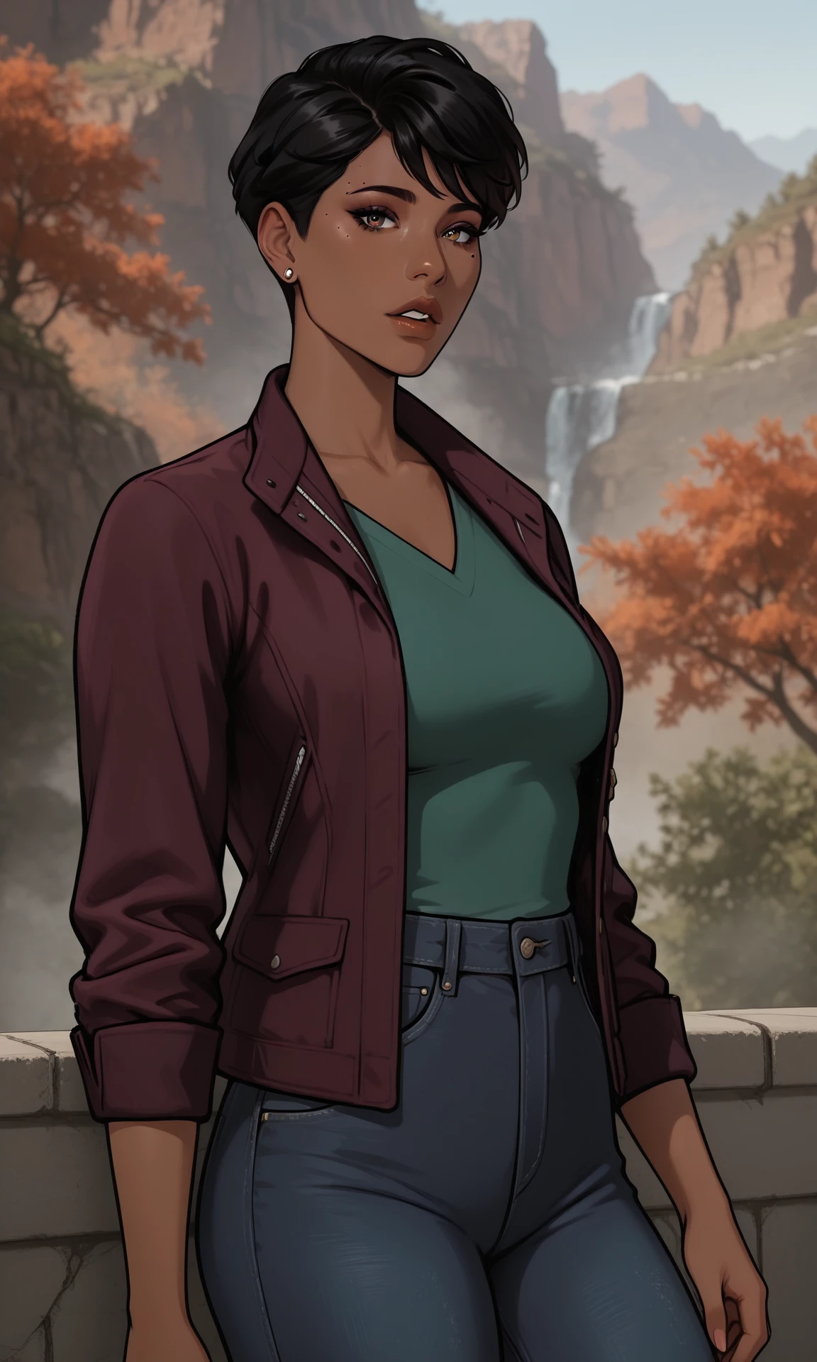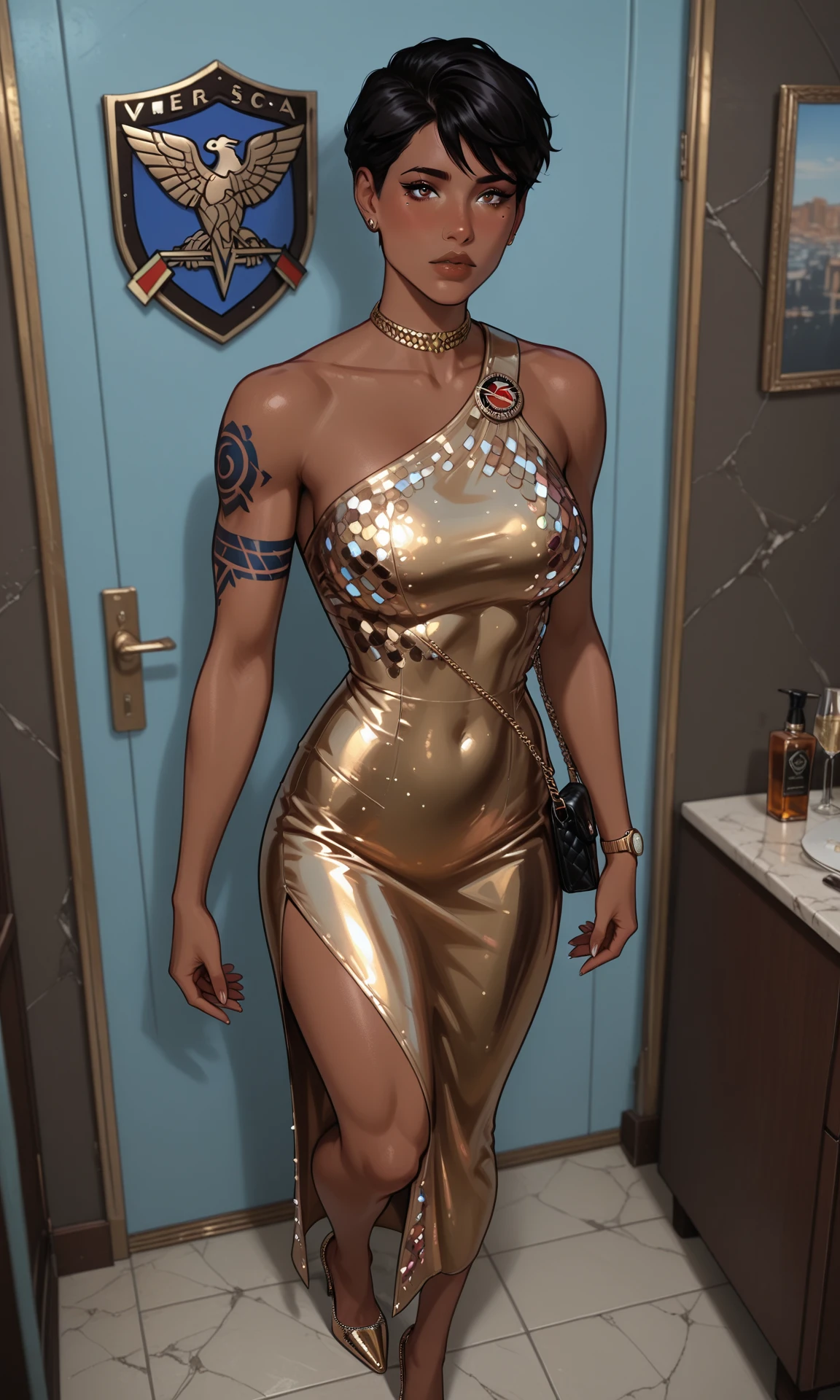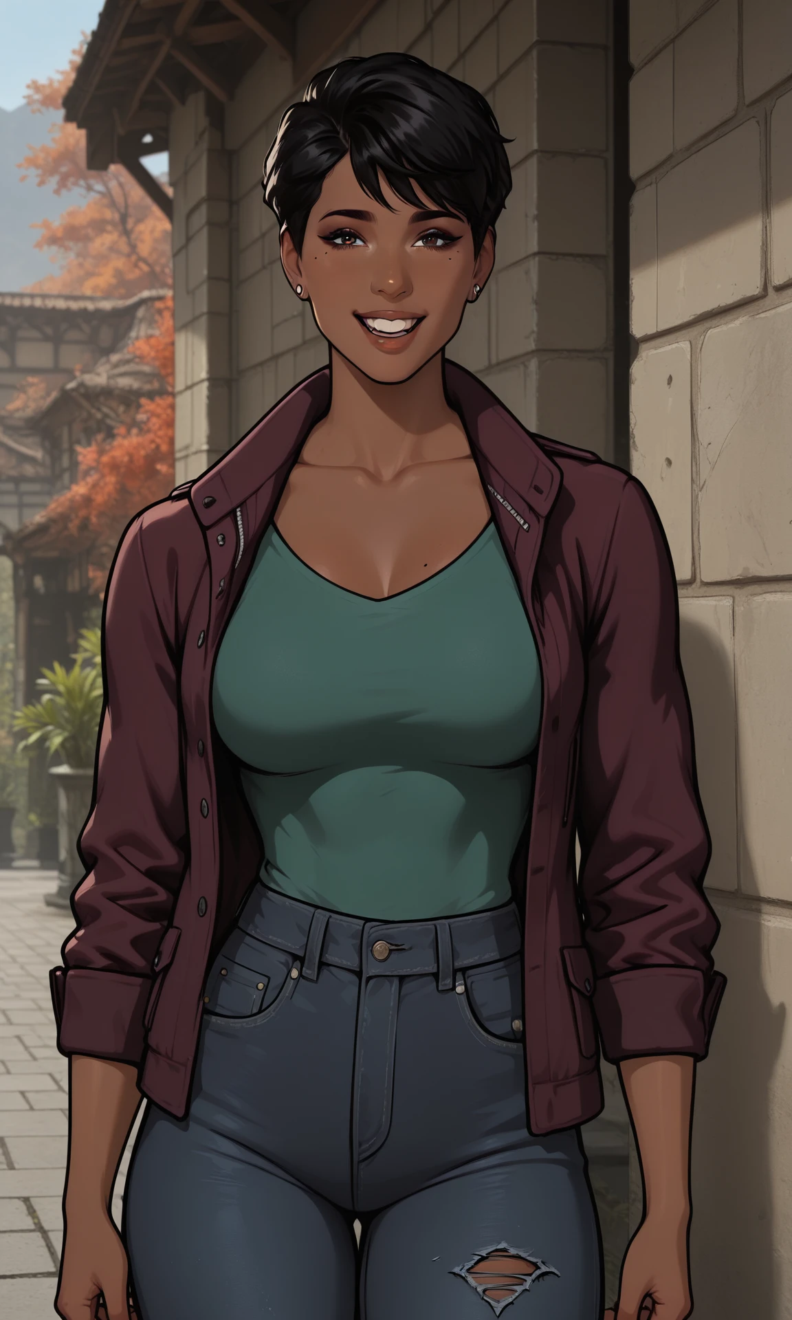 zara khan, dark-skinned female, short hair, black hair, earrings, very dark skin, mole below right eye