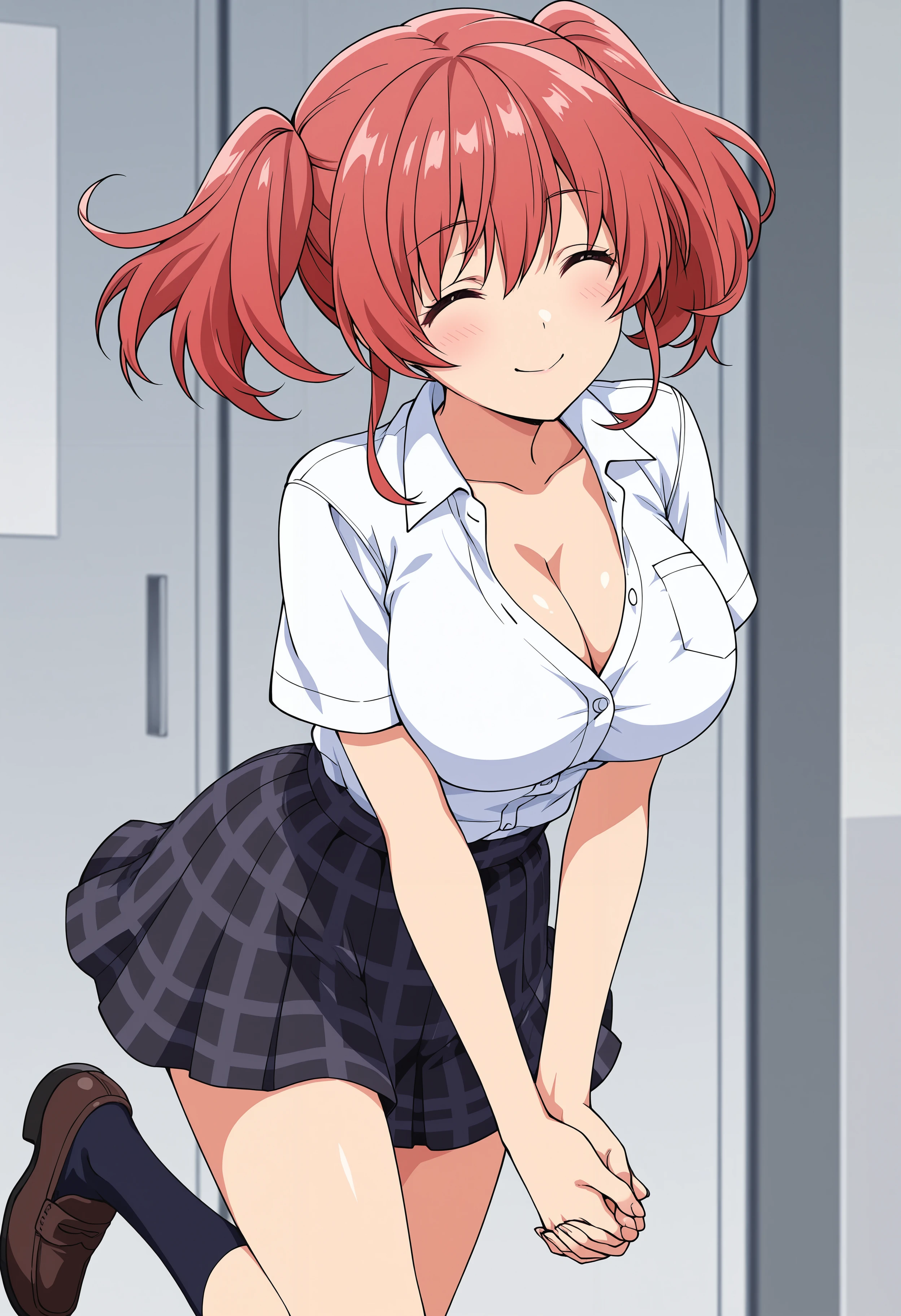 school uniform, shirt, plaid skirt, cleavage, thighhighs, necklace,