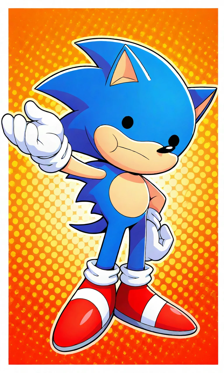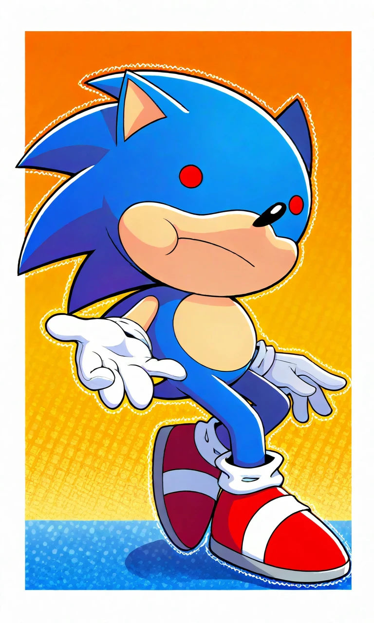 SunkyMPEG, 1boy, blue fur, peach skin, black eyes, no sclera, white gloves, iconic red shoes, sonic the hedgehog, :t