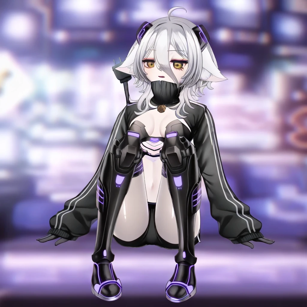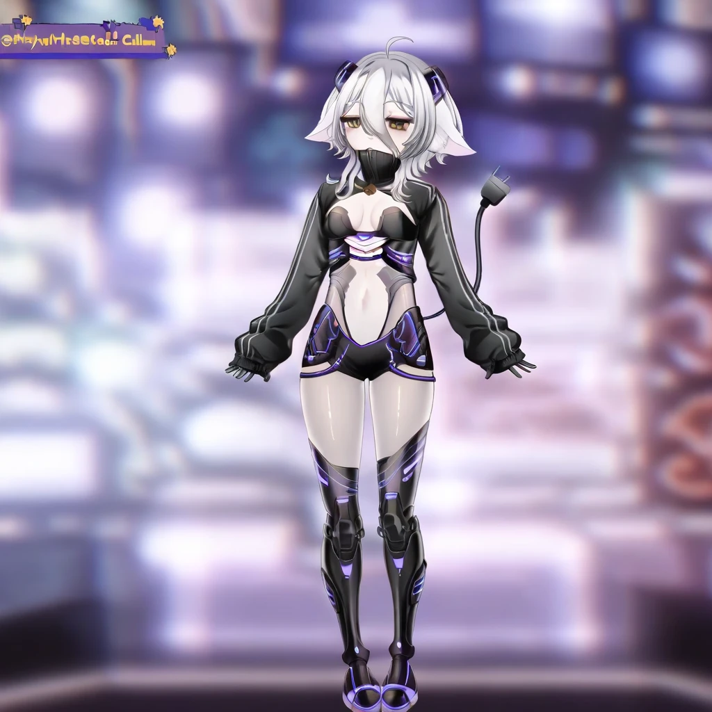 Henya - cyberpunk outfit, yellow eyes, grey hair, short hair with long locks, long hair between eyes, animal ears, animal ear fluff, ahoge, mechanical horns, pale skin, high collar, shrug \(clothing\), black sleeves, sleeves past wrists, black gloves, black bodysuit, neon trim, cleavage cutout, stomach cutout, navel, black shorts, short shorts, see through thighhighs, black footwear, mechanical legs, legs, cable tail, cyber mask
