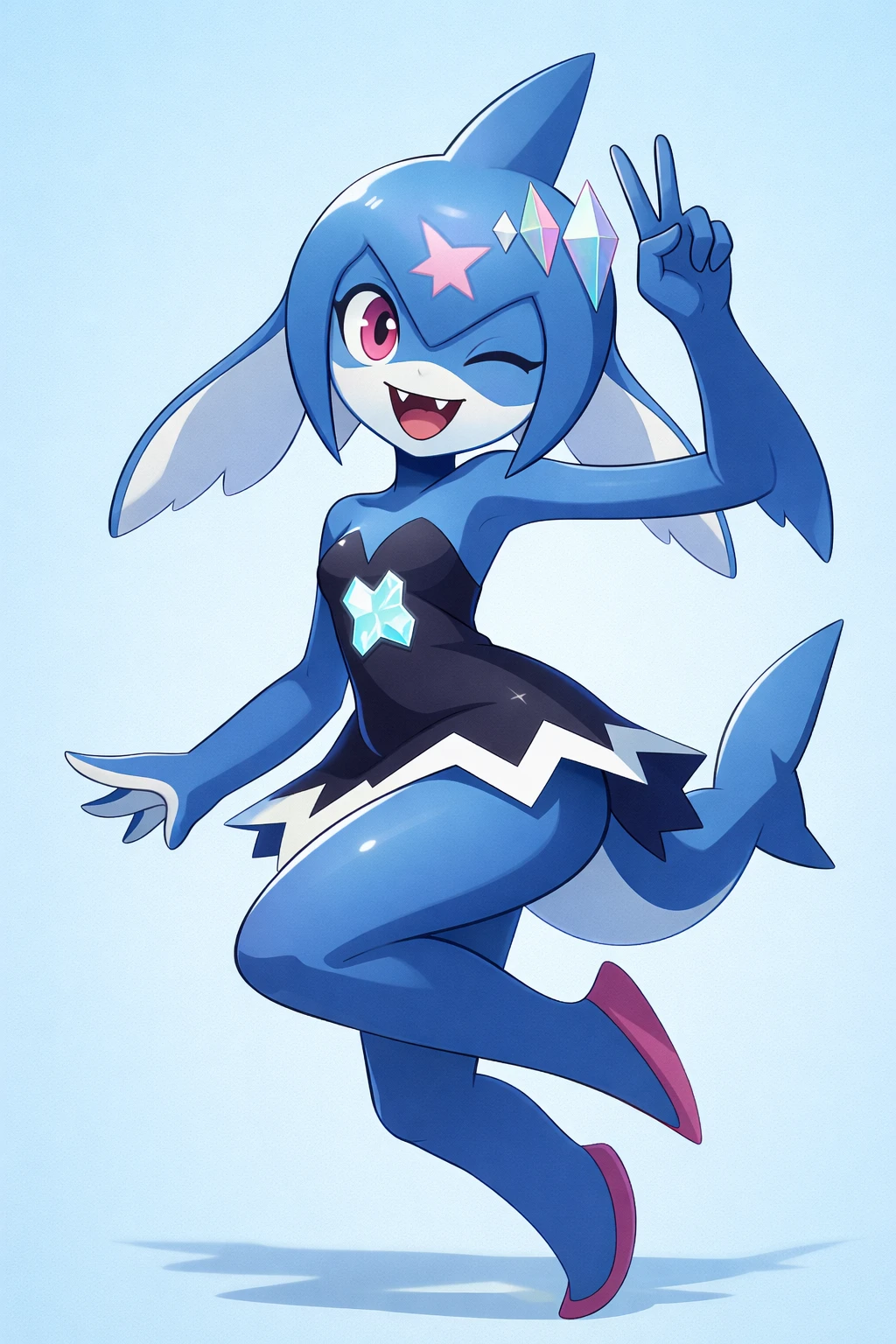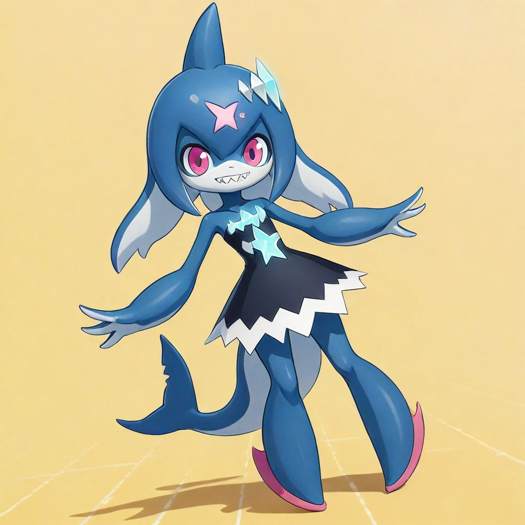 masterpiece, best quality, newest, detailed shading, stylized cartoon creature, 1girl, solo, shark girl, Gnashley_(Palmon), creature-like anatomy, slim, petie, slightly oversized head, smooth blue skin, pink eyes, sharp teeth, star marking on forehead, fin-like head crest, long fin ears, shark tail, stylized limbs, pink foot pads, no feets, no toes, rounded legs, dark dress with white zigzag trim, glowing crystal accents, clean design, cel-shading