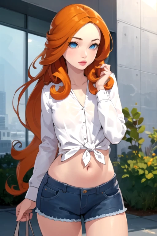 QuinnKelly, 1girl, solo, very long hair, blue eyes, brown hair, white shirt, long sleeves, navel, small breasts, short shorts, midriff, orange hair, lips, denim shorts, tied shirt, cutoffs
