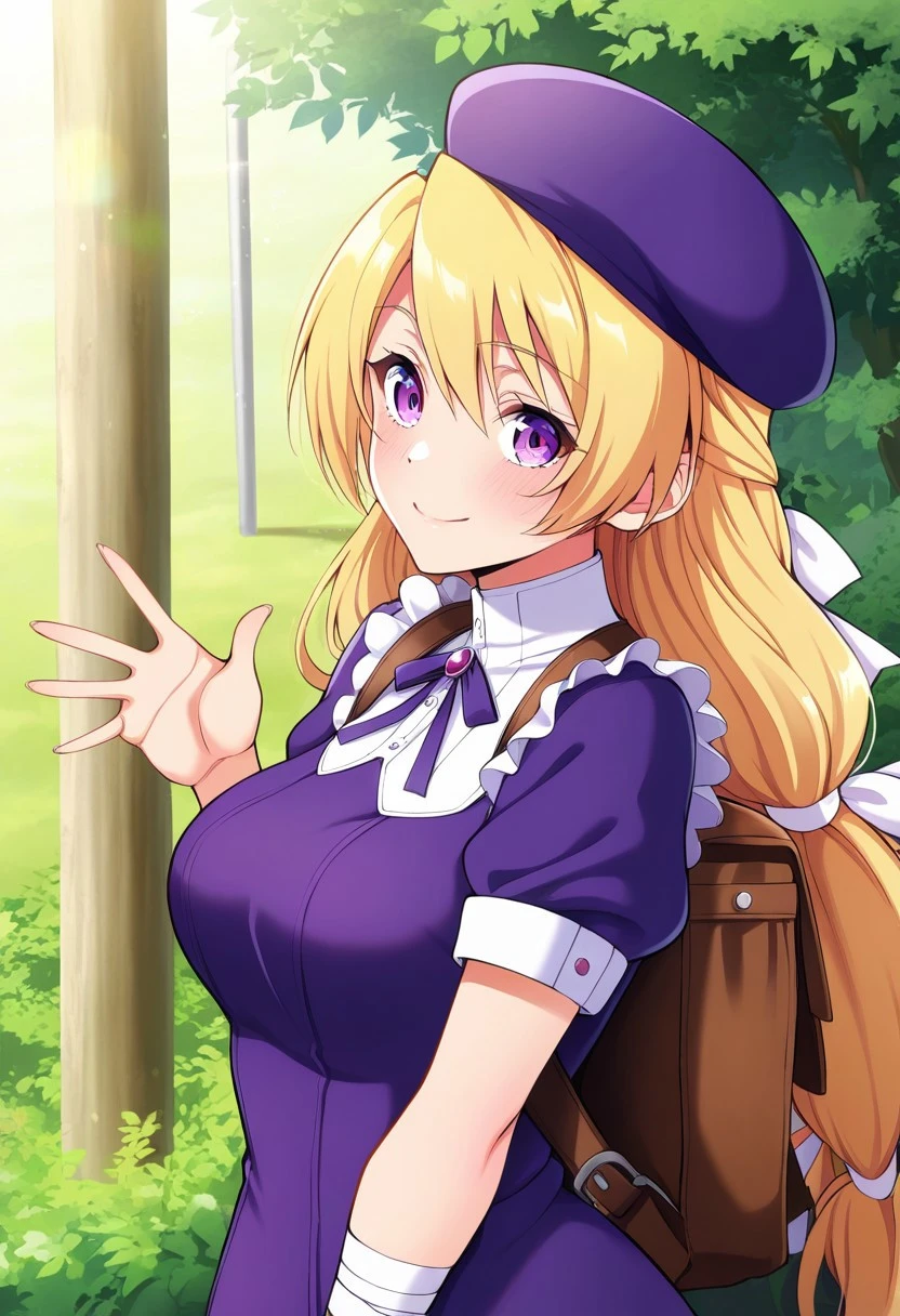 shijou hinako,masterpeace,blond hair,long hair,purple eyes,purple dress,short sleeves,white frills,purple beret,hair ribbon,brown bag,bandages,black boot