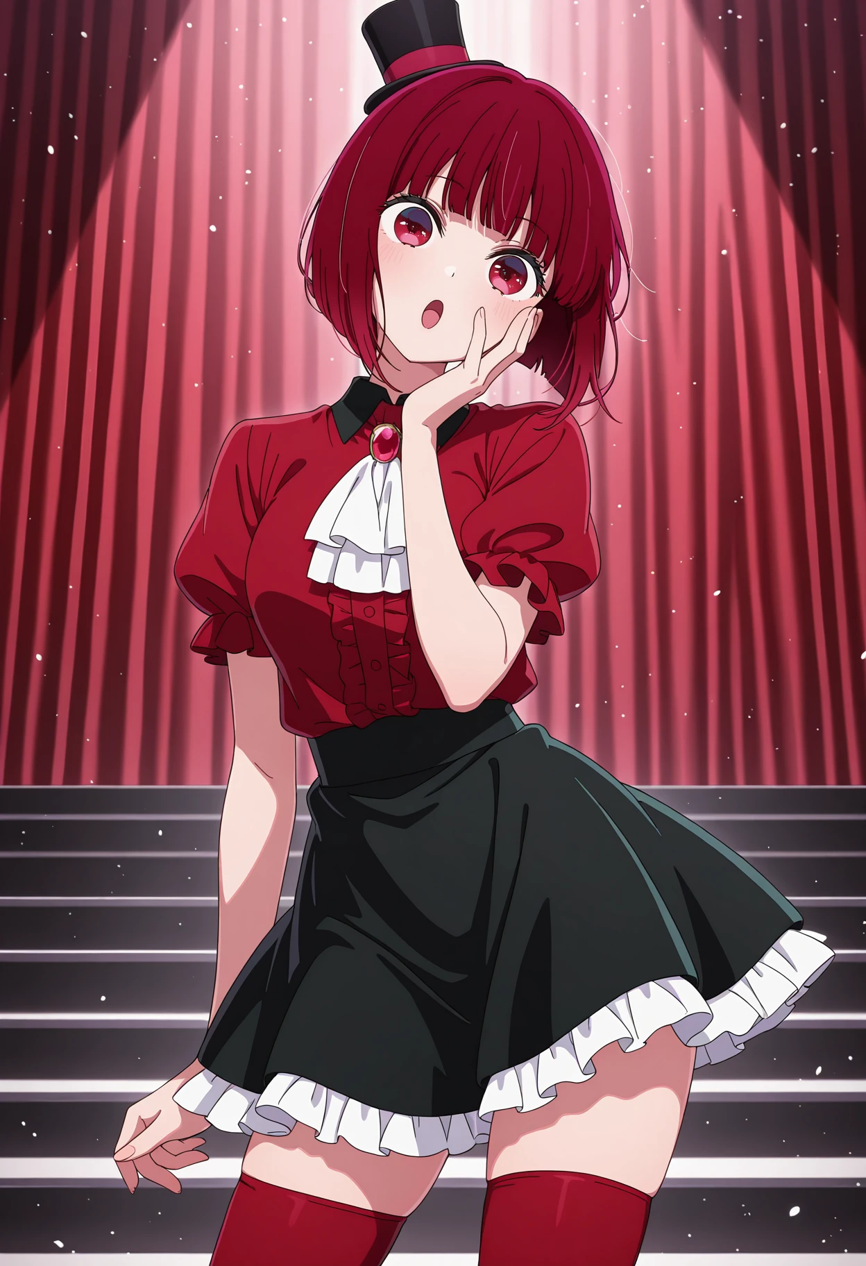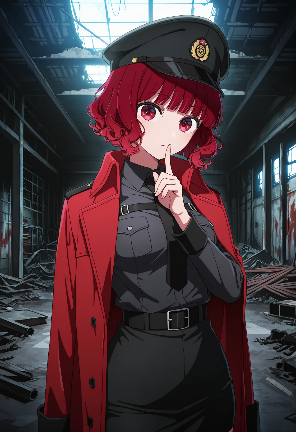 KJOkana, red hair, red eyes, short hair, blunt bangs, curly hair,