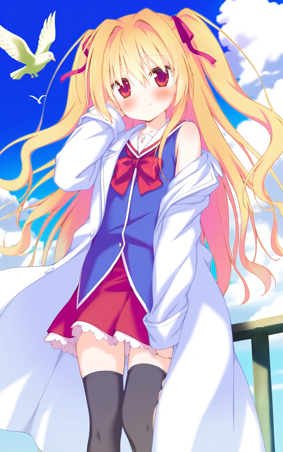 two side up, hair ribbon, long hair, black thighhighs, off shoulder, serafuku, blue school uniform,red skirt, bow, lab coat,cloth boots,