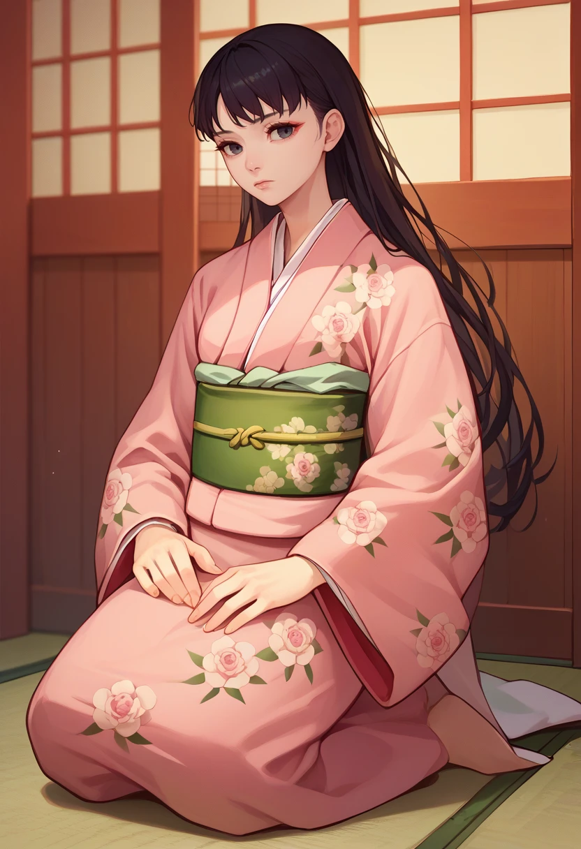 Amagi Inn Kimono: yukikokimono, japanese clothes, pink kimono, floral print, green sash, obi
