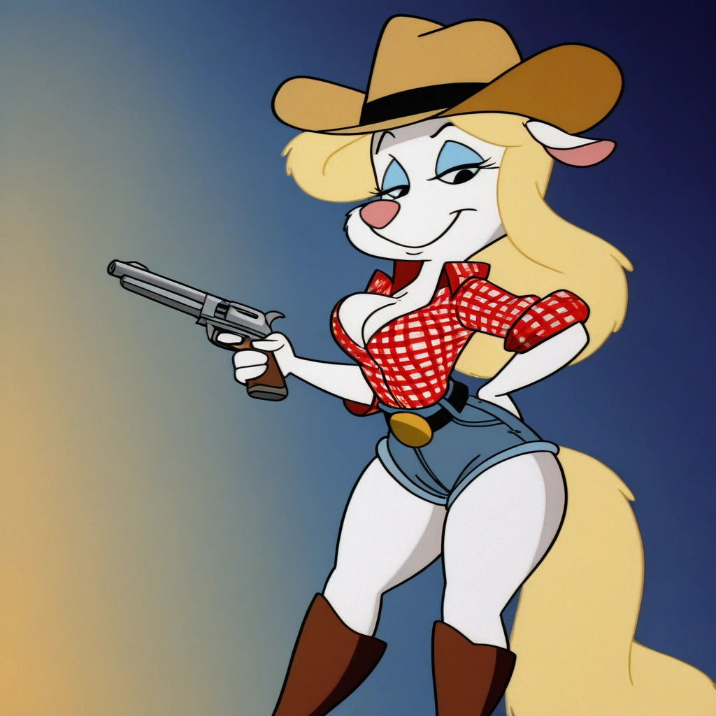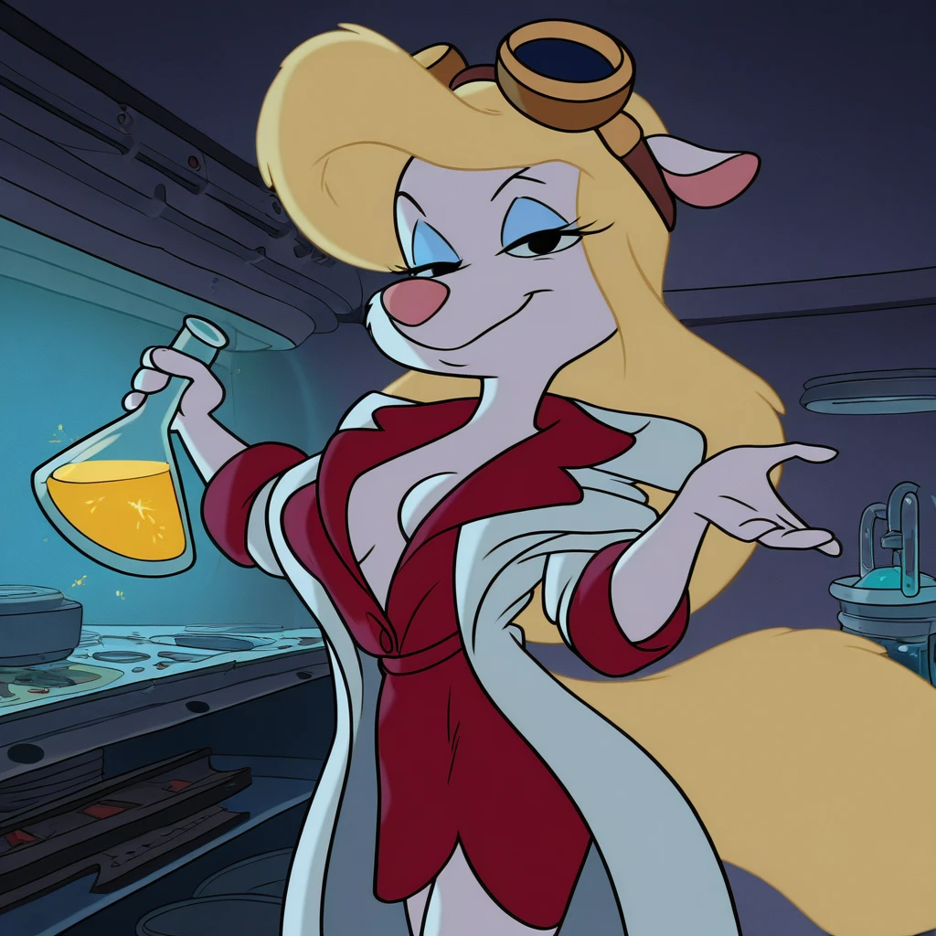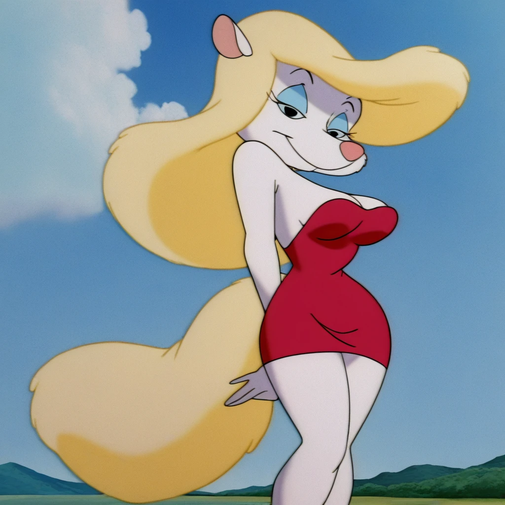 furry female, white skin, blonde hair, long hair, pink animal nose, black eyes, blue eyeshadow, breasts, red mini dress, blonde fox tail