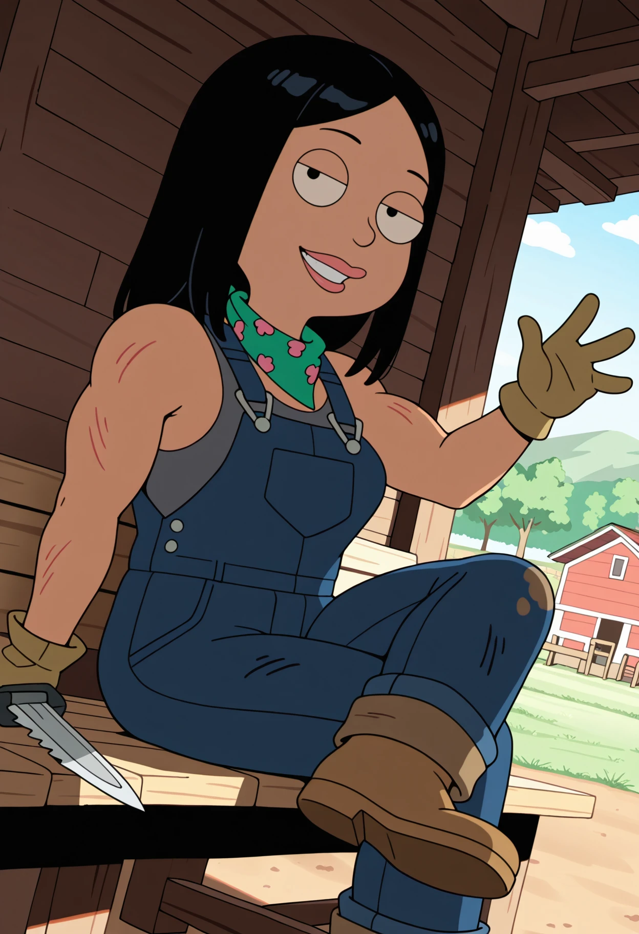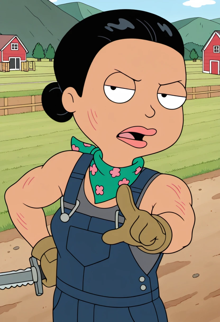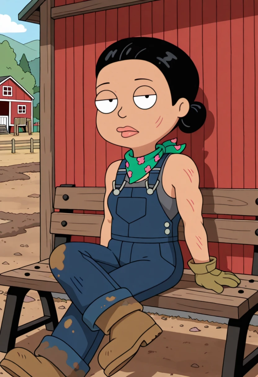 farmerhayley, 1girl, solo, black hair, hair bun, tan, lips, blue overalls, denim, dirty overalls, green bandana, floral print, work gloves sleeveless, grey tank top, grey undershirt, brown boots, scratches, muscular female,