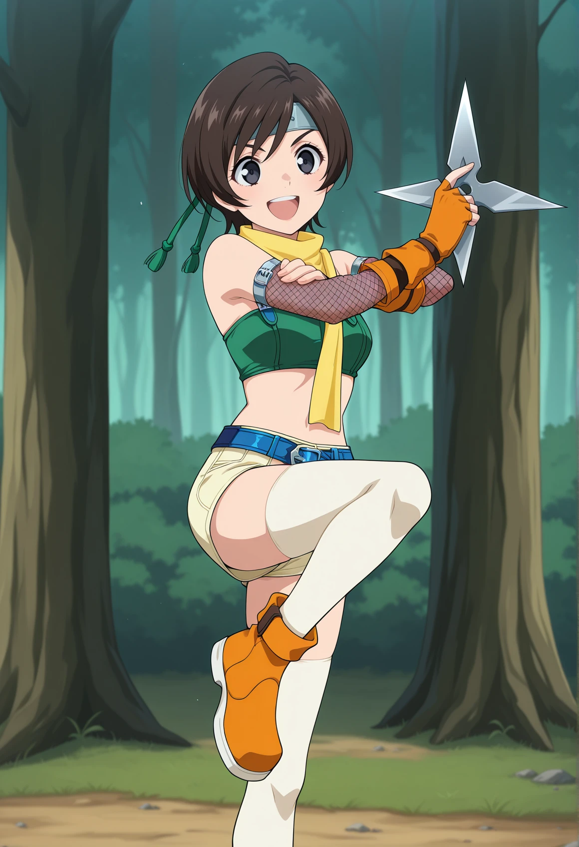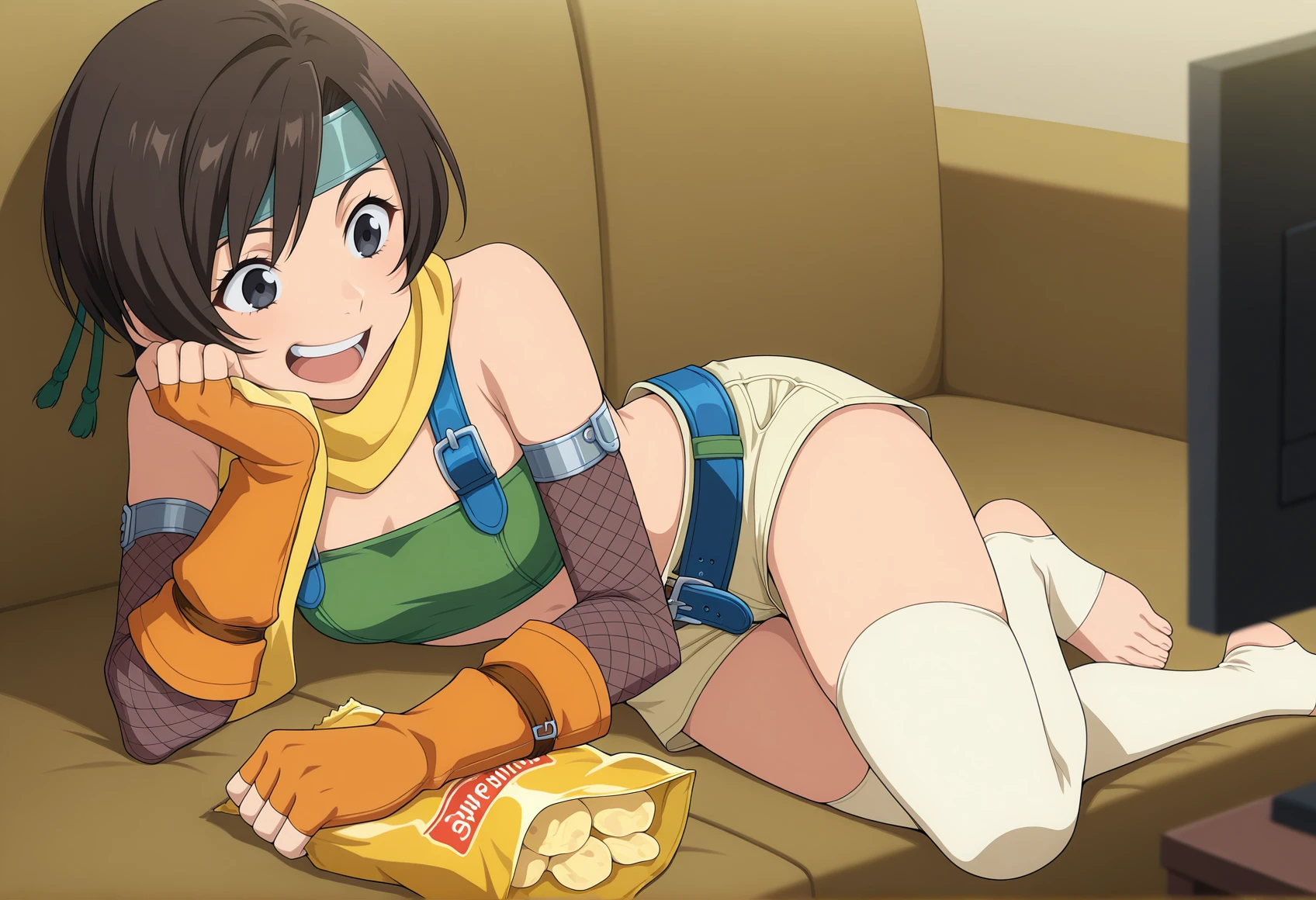 brown hair, black eyes, short hair, headband, scarf, tube top, strap, fishnet armwear, fingerless gloves, shorts, belt, White thighhighs