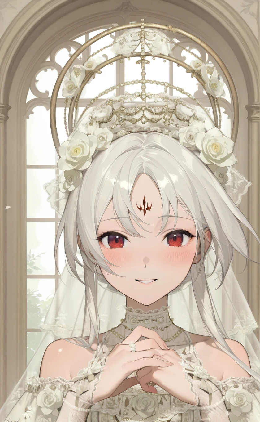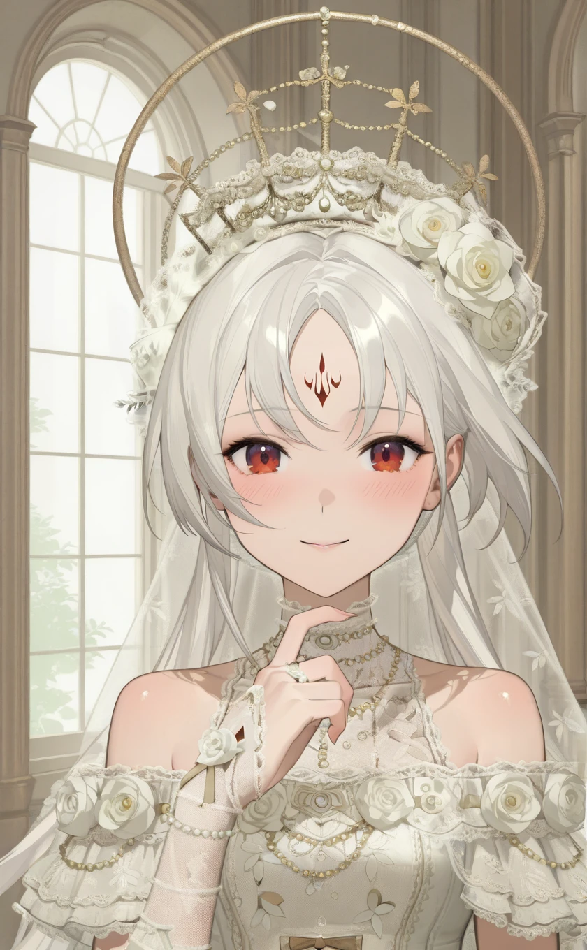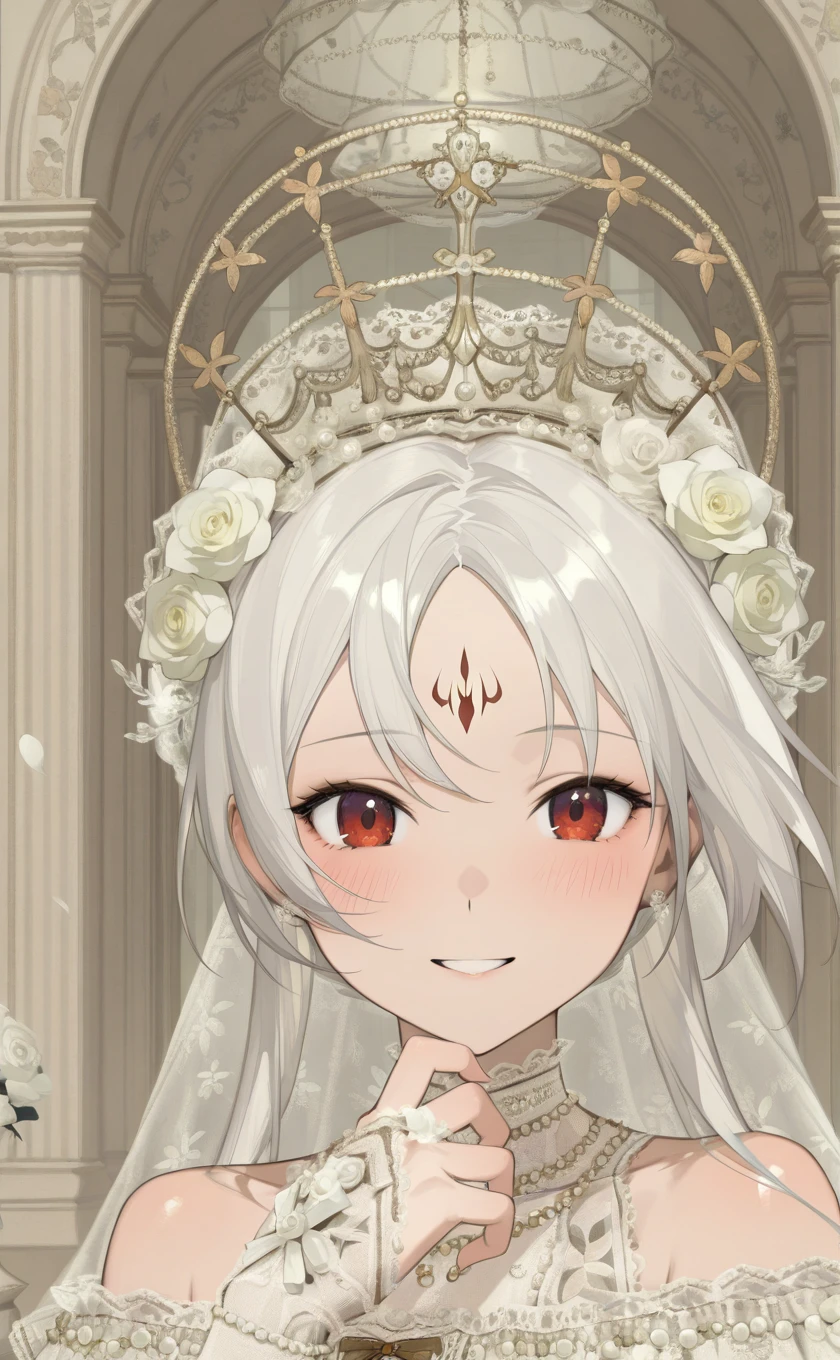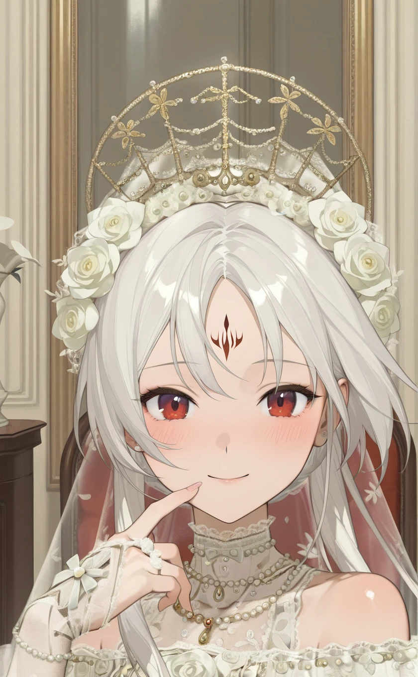 very long hair,white hair,hair ornament,hair flower,white flower,veil,forehead mark,red eyes