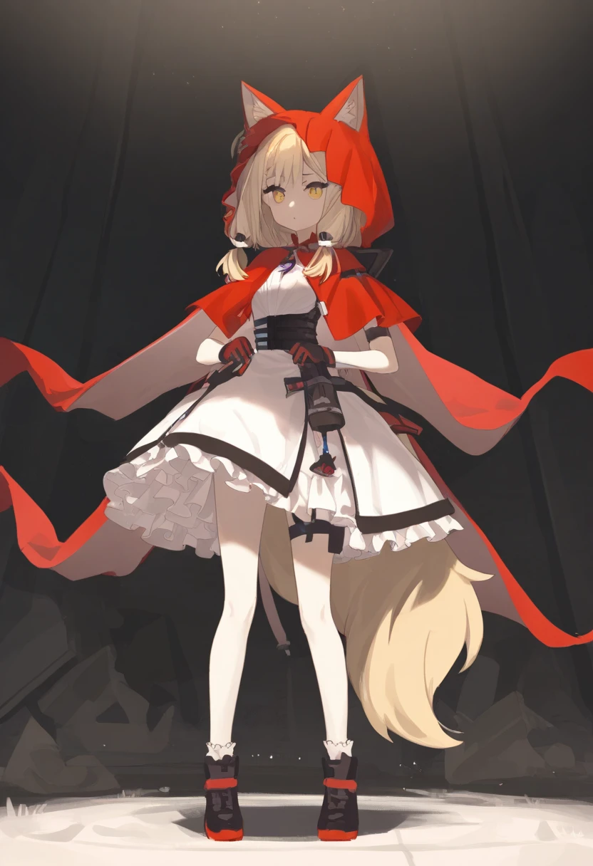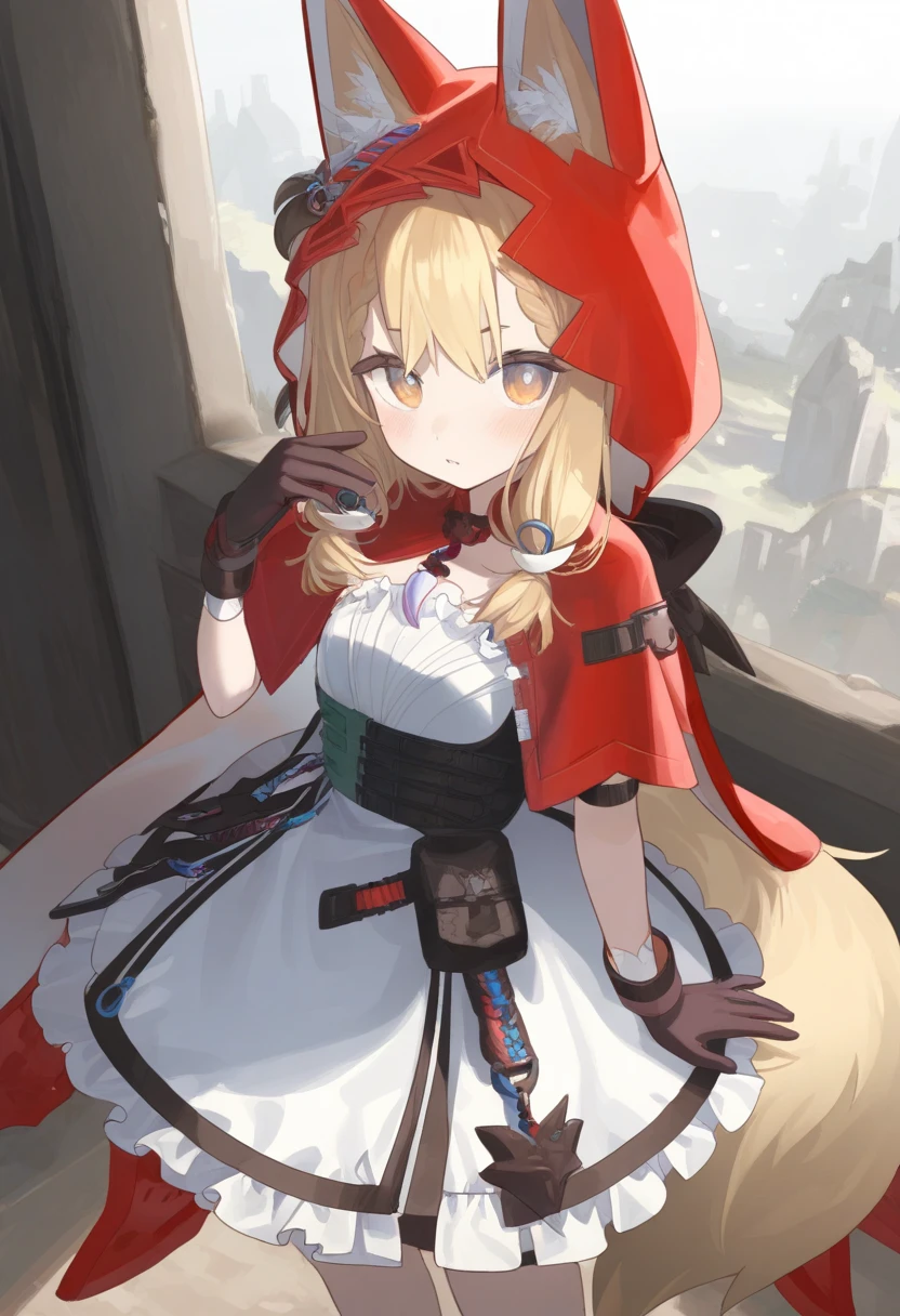 EarthRoss, 1girl, standing, frills, gloves, blonde hair, tail, ears, red hood