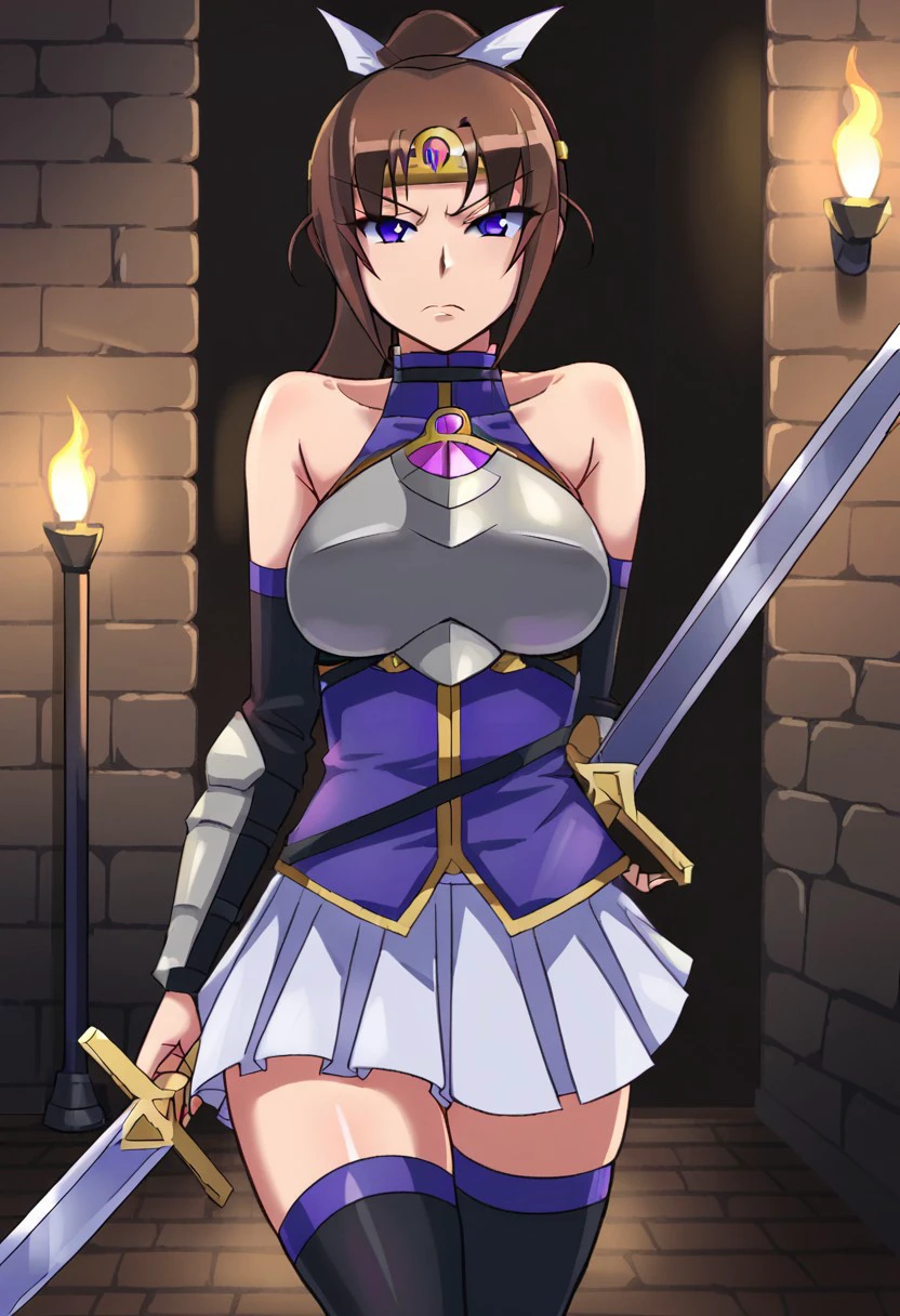 Dianne's normal outfit: black choker, (purple top, turtleneck, sleeveless, gold trim), (white skirt, pleated skirt,), (black thighhighs, purple trim), (black arm warmers, purple trim), (chest armor, breastplate, silver,) gem, (arm armor, silver), (armored boots, silver), (sword, holding sword, one sword,),