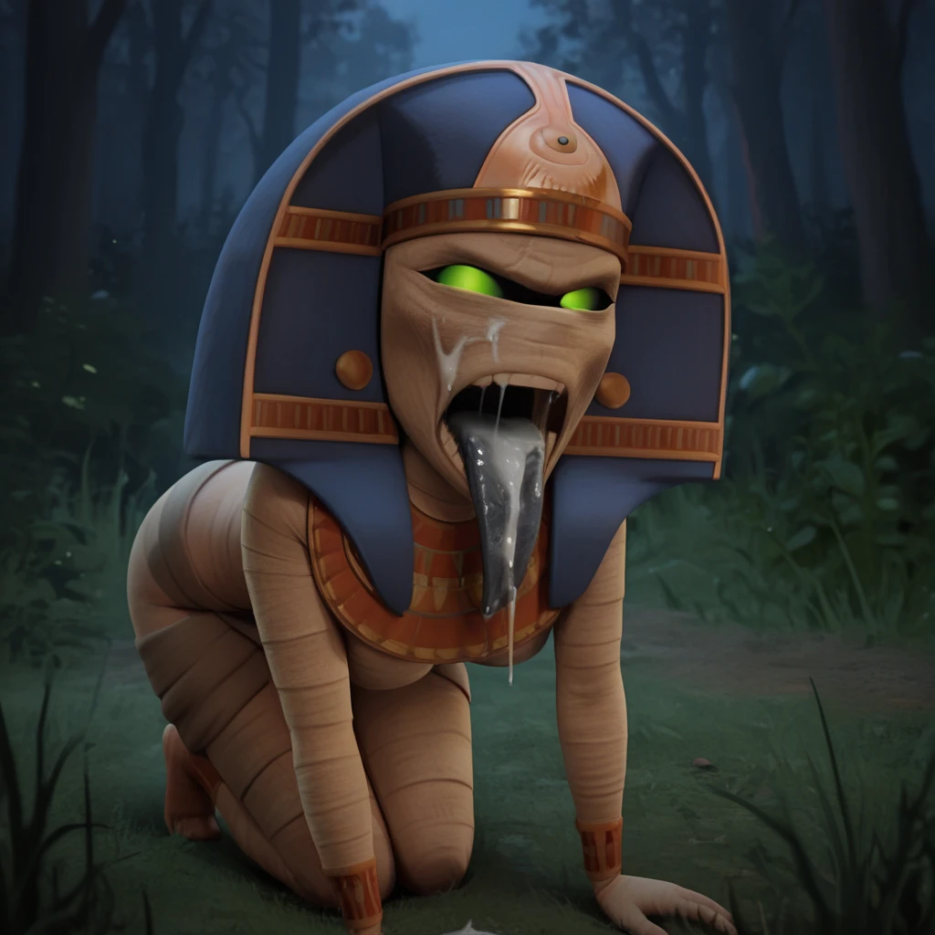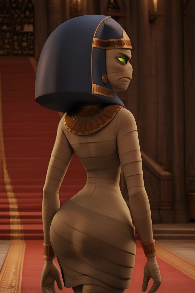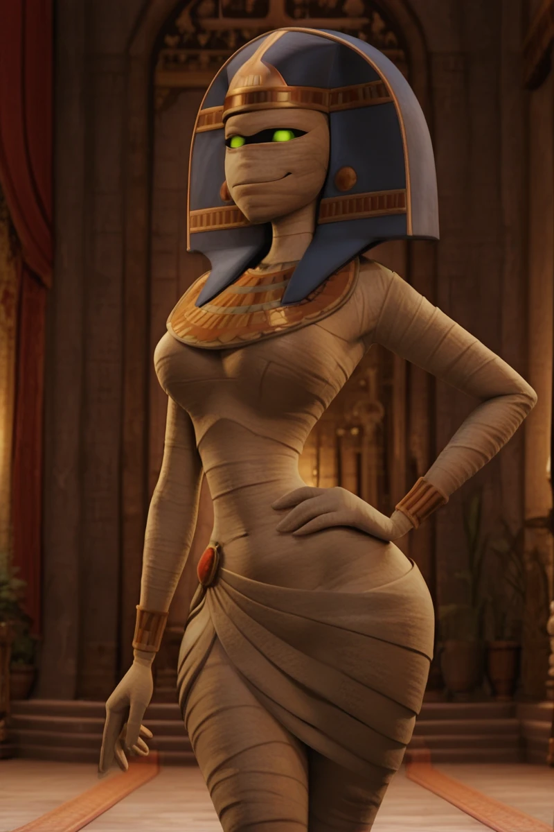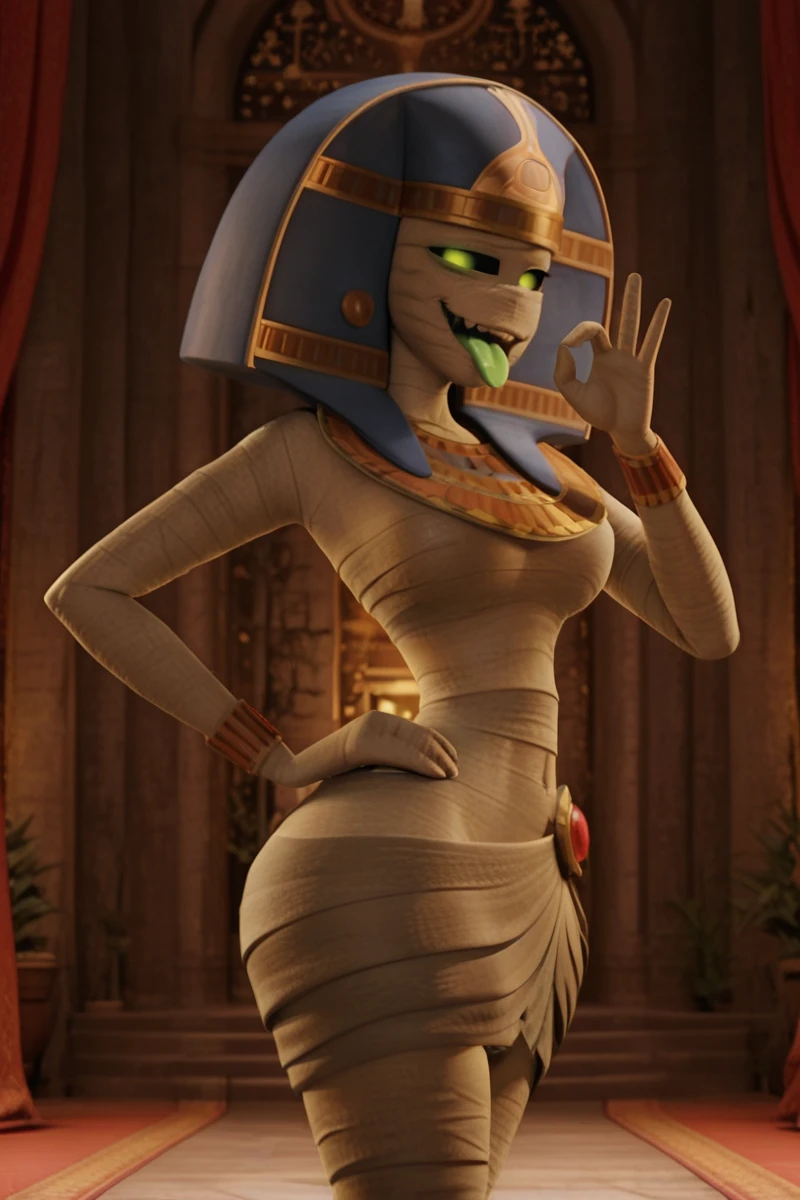 h0t3l_tr4nsylv4v4_mumm3y, female, (noseless:1.2), not furry, alien, blue headwear, (mummy, wrappings, mummy wrappings), egyptian headdress, egyptian neckwear, bracelet, fully clothed, wraps, gold jewelry, bondage gloves, slim, wide hips, pose, ruby, bandage skirt, empty eyes, face covered, mouth covered, green eyes, glowing eyes, brown bandage, mitten hands,