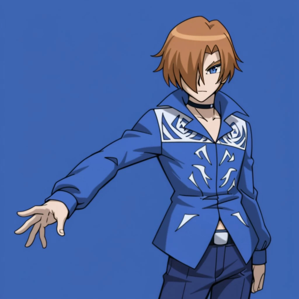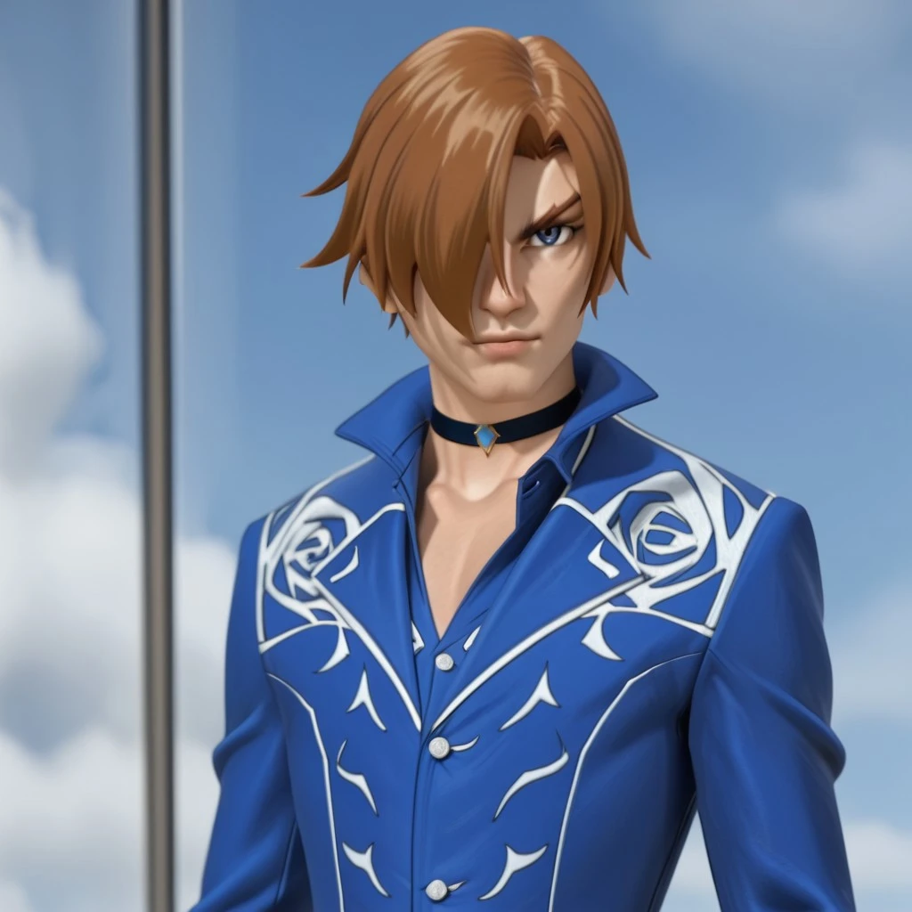 1boy, wales, blue eyes, hair over one eye, choker, brown hair,