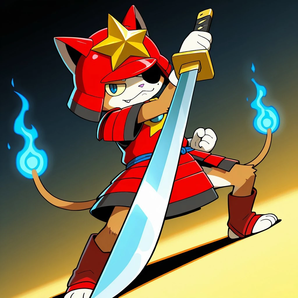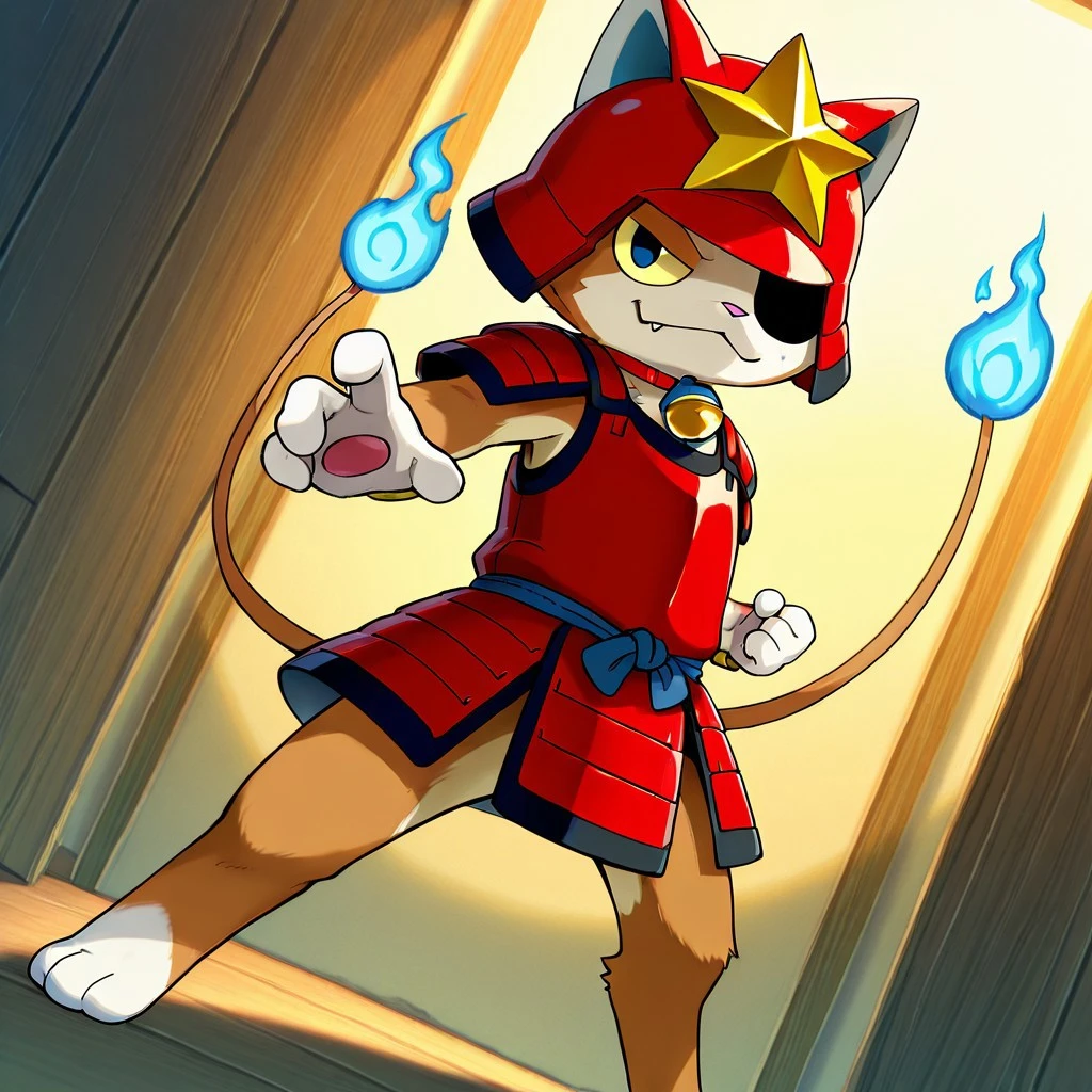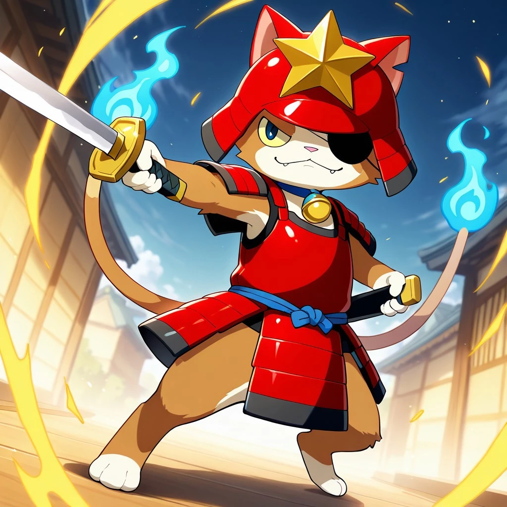 solo,male,anthro cat,chibi,light-brown fur,white face,yellow sclera,black pupils,two tails,blue flame tipped-tail,collar with blue bell,white hands,white paws,pink nose,fang,red helmet with big yellow star,red armor,light-brown legs,black eye-patch,
