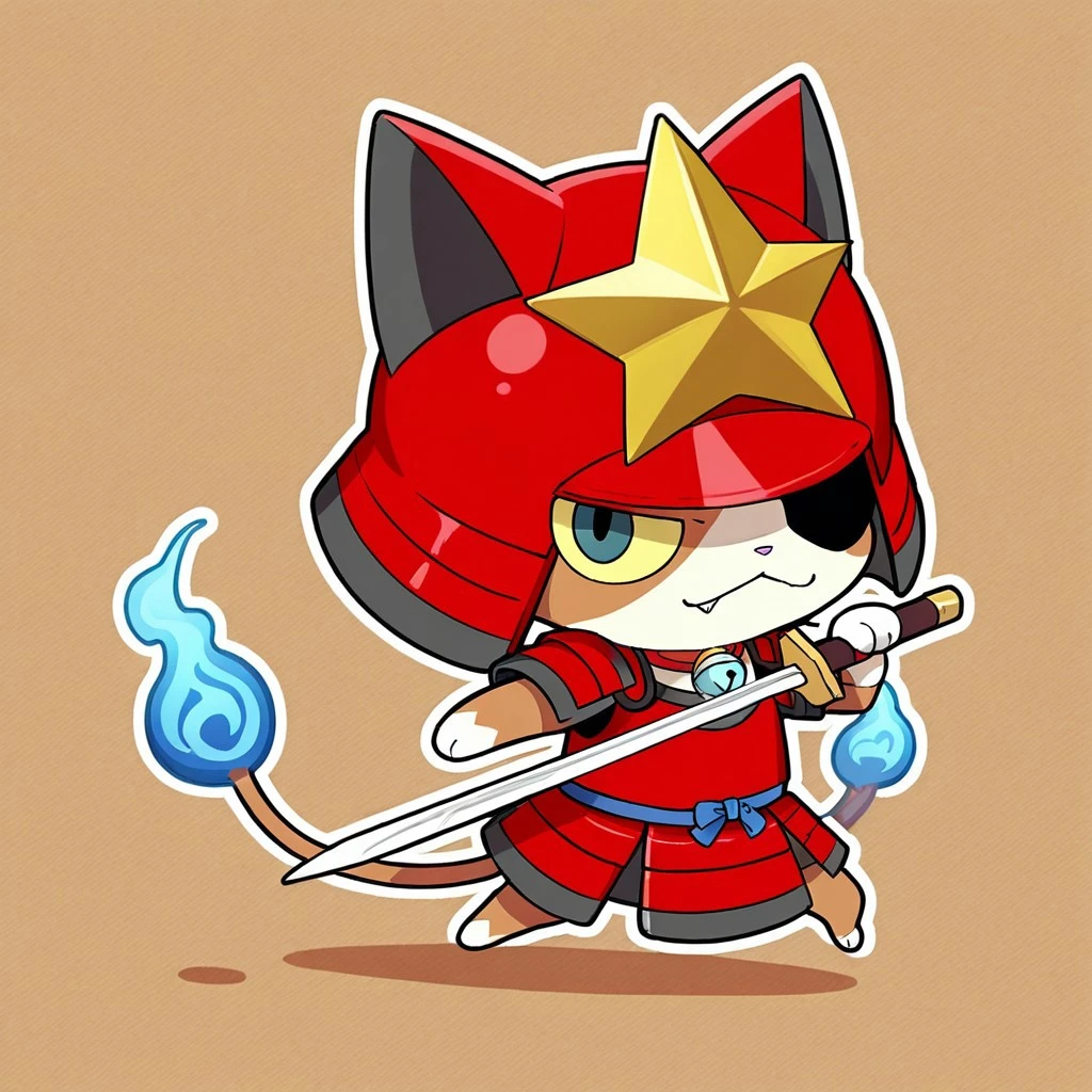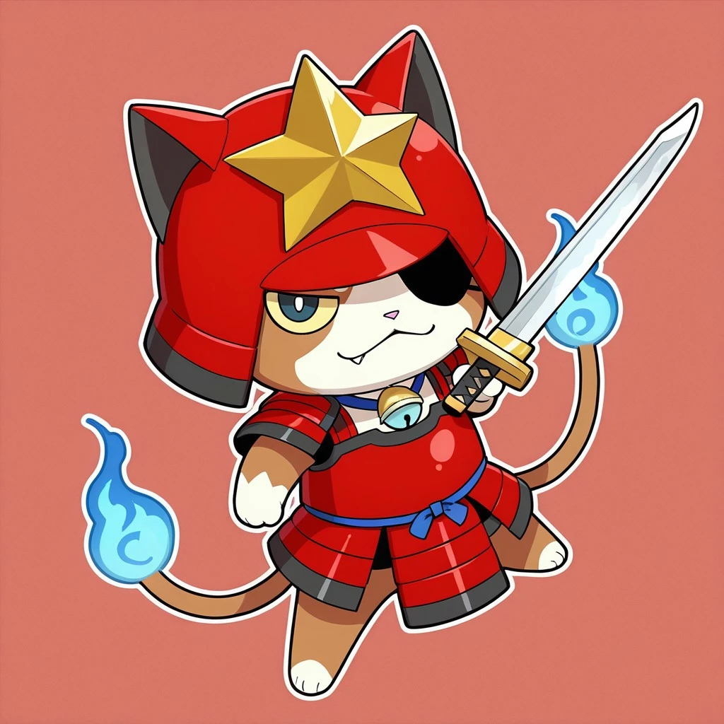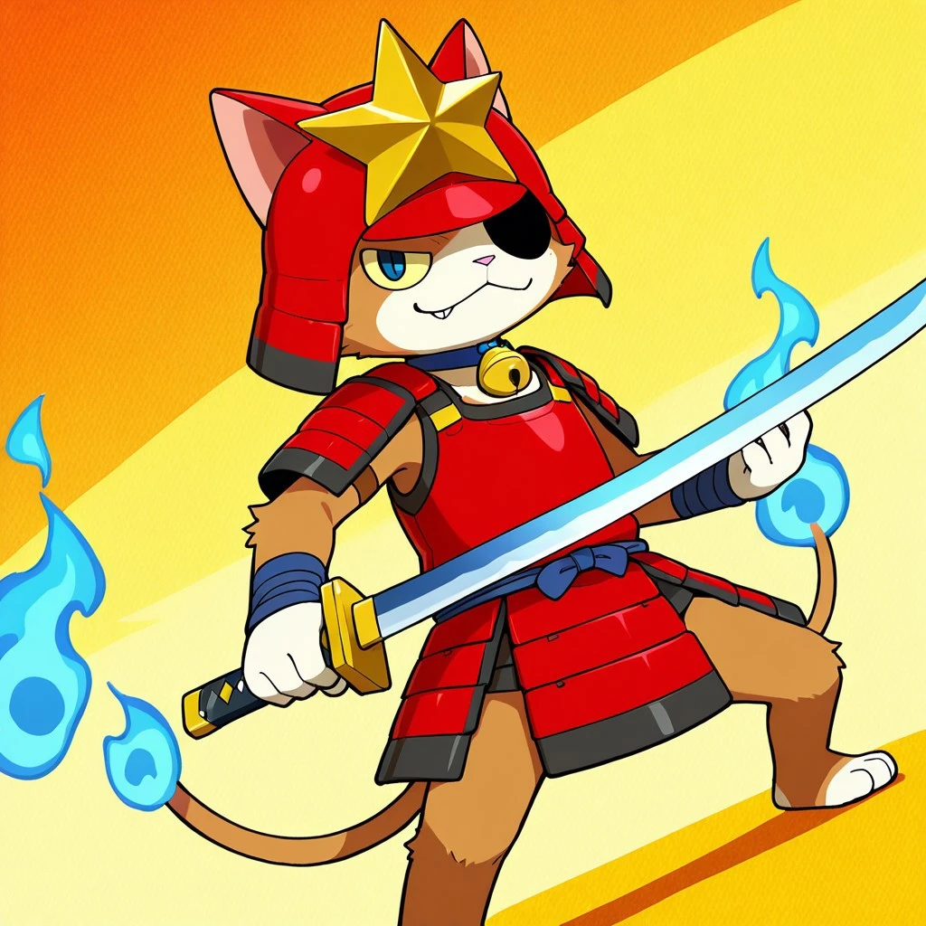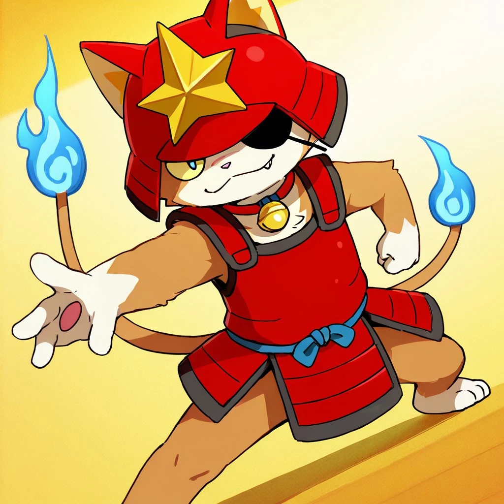 solo,male,anthro cat,chibi,light-brown fur,white face,yellow sclera,black pupils,two tails,blue flame tipped-tail,collar with blue bell,white hands,white paws,pink nose,fang,red helmet with big yellow star,red armor,light-brown legs,black eye-patch,